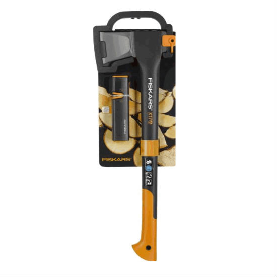 Топор-колун Х17 + точилка Fiskars 129050 может использоваться для рубки поленьев диаметром 20 см и более. Лезвие из закаленной стали надежно зафиксировано в топорище и имеет антифрикционное покрытие, препятствующее образованию коррозии. Для поддержания режущих свойств инструмента предусмотрена универсальная точилка, имеющая пазы как для топоров, так и ножей. Защитная планка точилки предохраняет руки и пальцы от повреждений во время заточки.