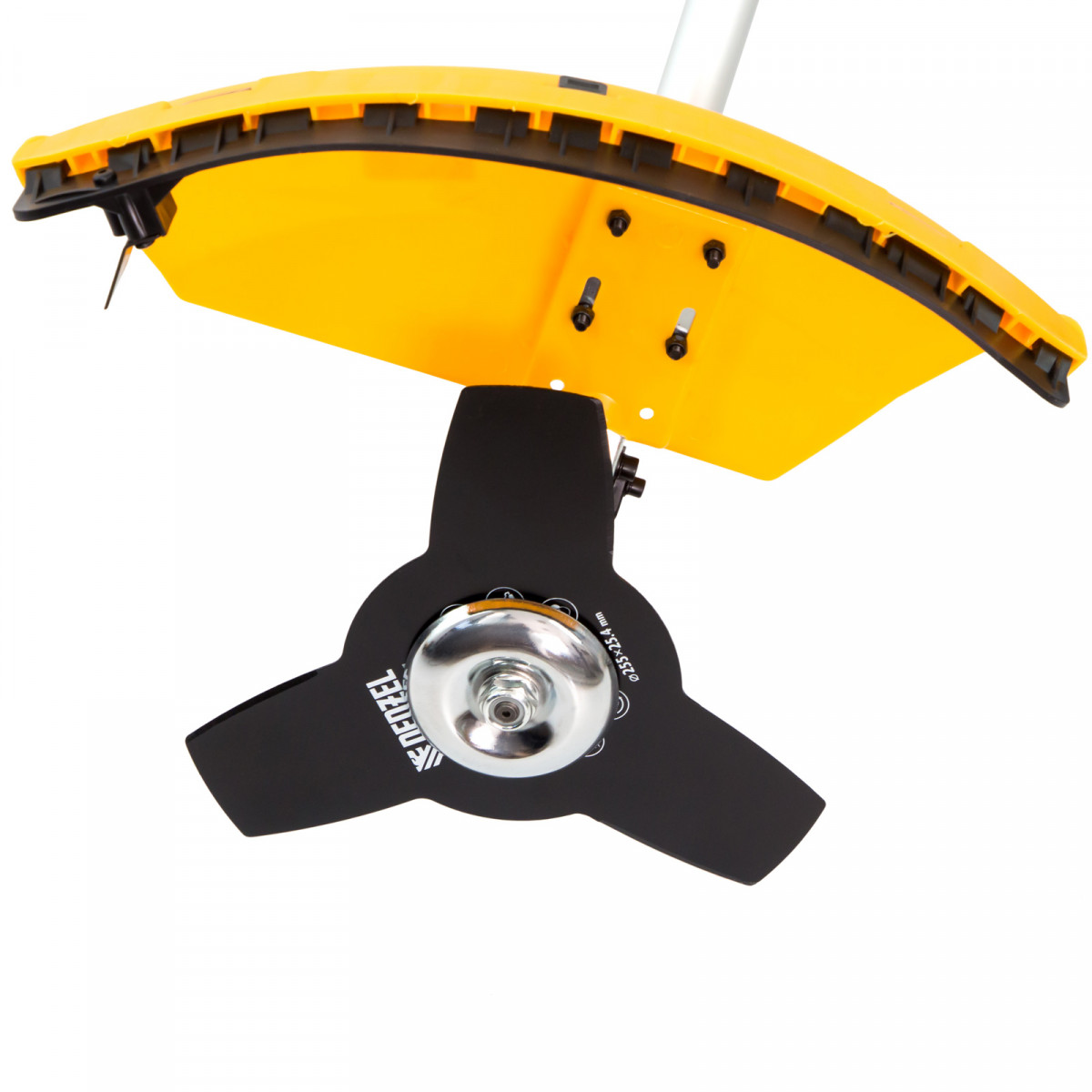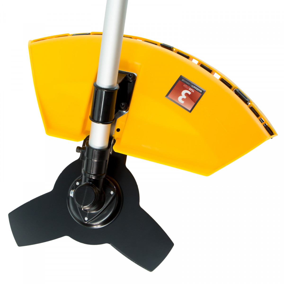 • Дополнительные возможности — можно приобрести диск Denzel 96323 с шириной скашивания 230 мм для быстрого удаления растительности с жесткими стеблями, 96328 для скашивания молодых побегов кустарника диаметром до 3 мм, 96340 для срезания борщевика, кустарника и молодых побегов деревьев с диаметром стволов до 10 мм.