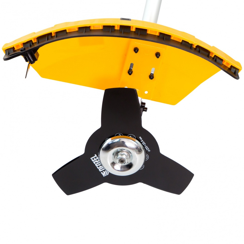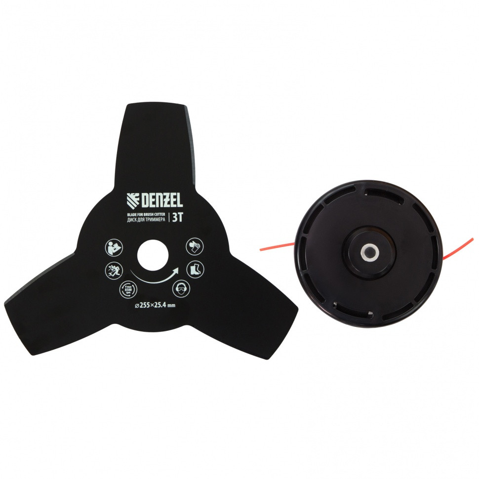 - Дополнительные возможности — можно приобрести диск Denzel 96323 с шириной скашивания 230 мм для быстрого удаления растительности с жесткими стеблями, 96328 для скашивания молодых побегов кустарника диаметром до 3 мм, 96340 для срезания борщевика, кустарника и молодых побегов деревьев с диаметром стволов до 10 мм.