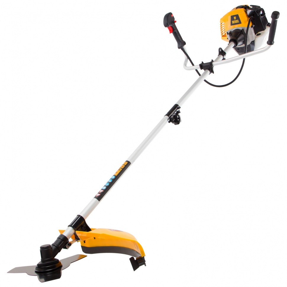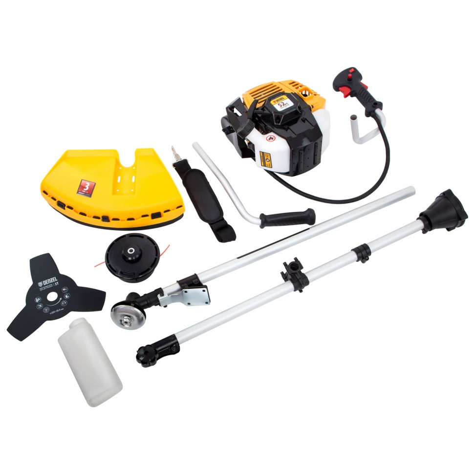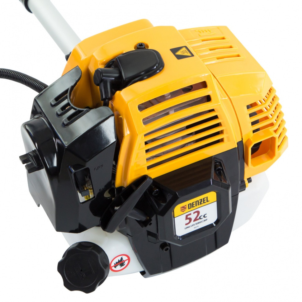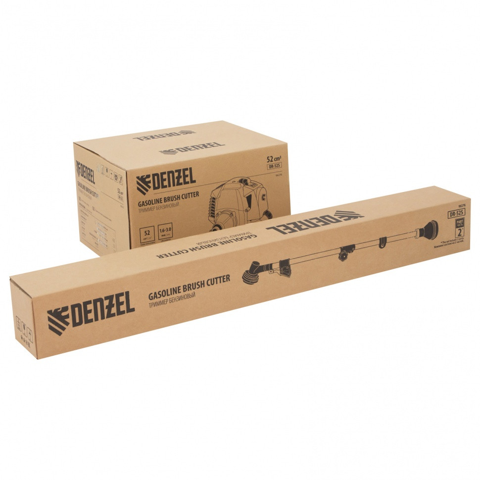 Бензиновый триммер Denzel DR-52S 96276 с двигателем объемом 52 см3 и разъемной штангой, состоит из 2 частей. Используется для ухода за газоном, скашивания травы различных типов, в том числе с жесткими стеблями (полынь, крапива, лебеда). Триммер эффективен на сложных участках: вдоль стен, в ямках и на возвышенностях, вокруг деревьев. Две режущие насадки — трехлопастный нож и катушка с леской — вращаются со скоростью 9500 об/мин, обеспечивая ширину скашивания 25,5 и 42 см. Эффективную работу инструмента обеспечивает двухтактный двигатель мощностью 3 л.с. При этом триммер экономично расходует топливо, поэтому часто заправлять его не придется.
