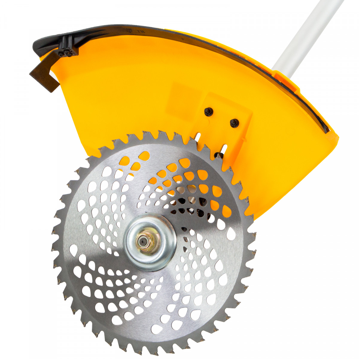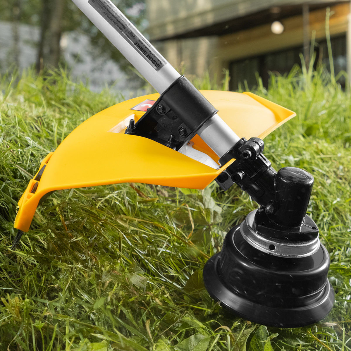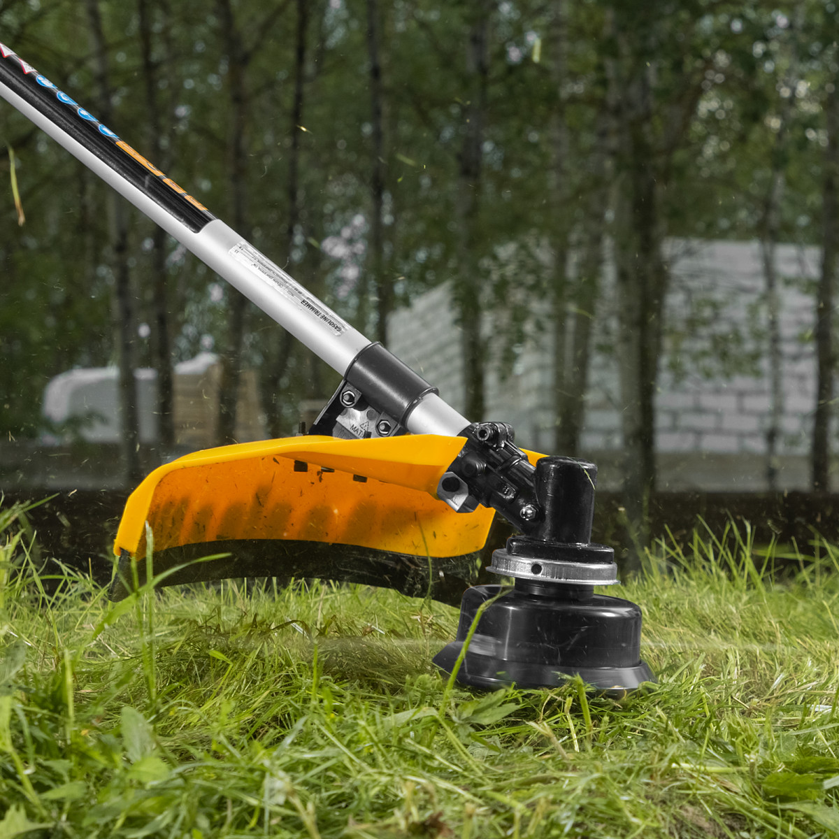 - Безопасная работа — пластиковый кожух защищает пользователя от вылетающей травы, щепок и камней.