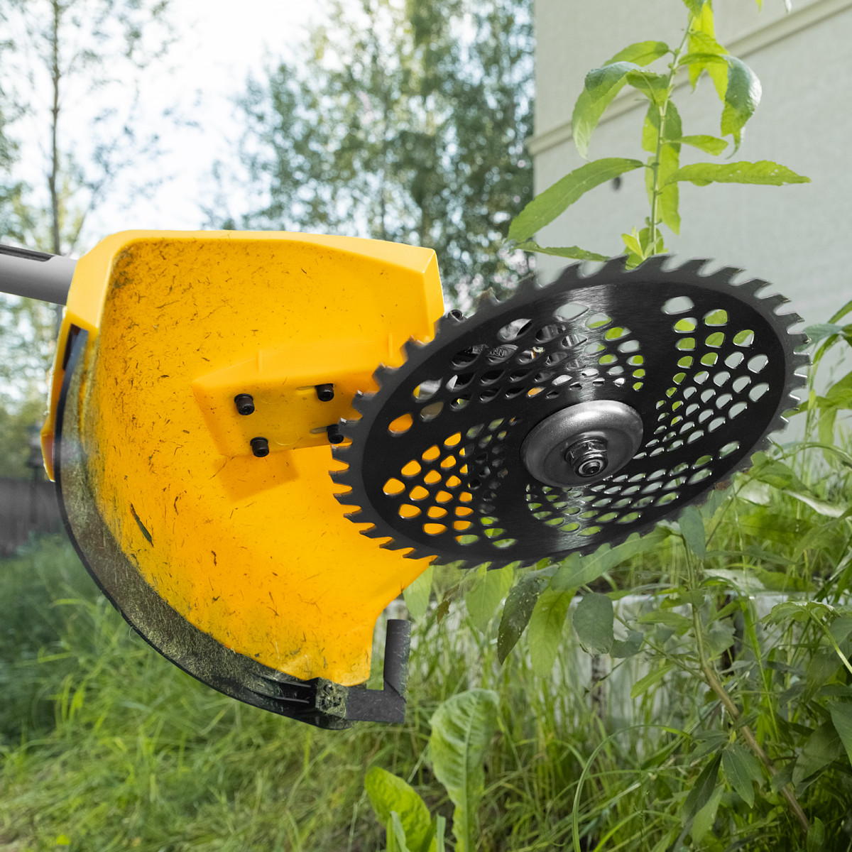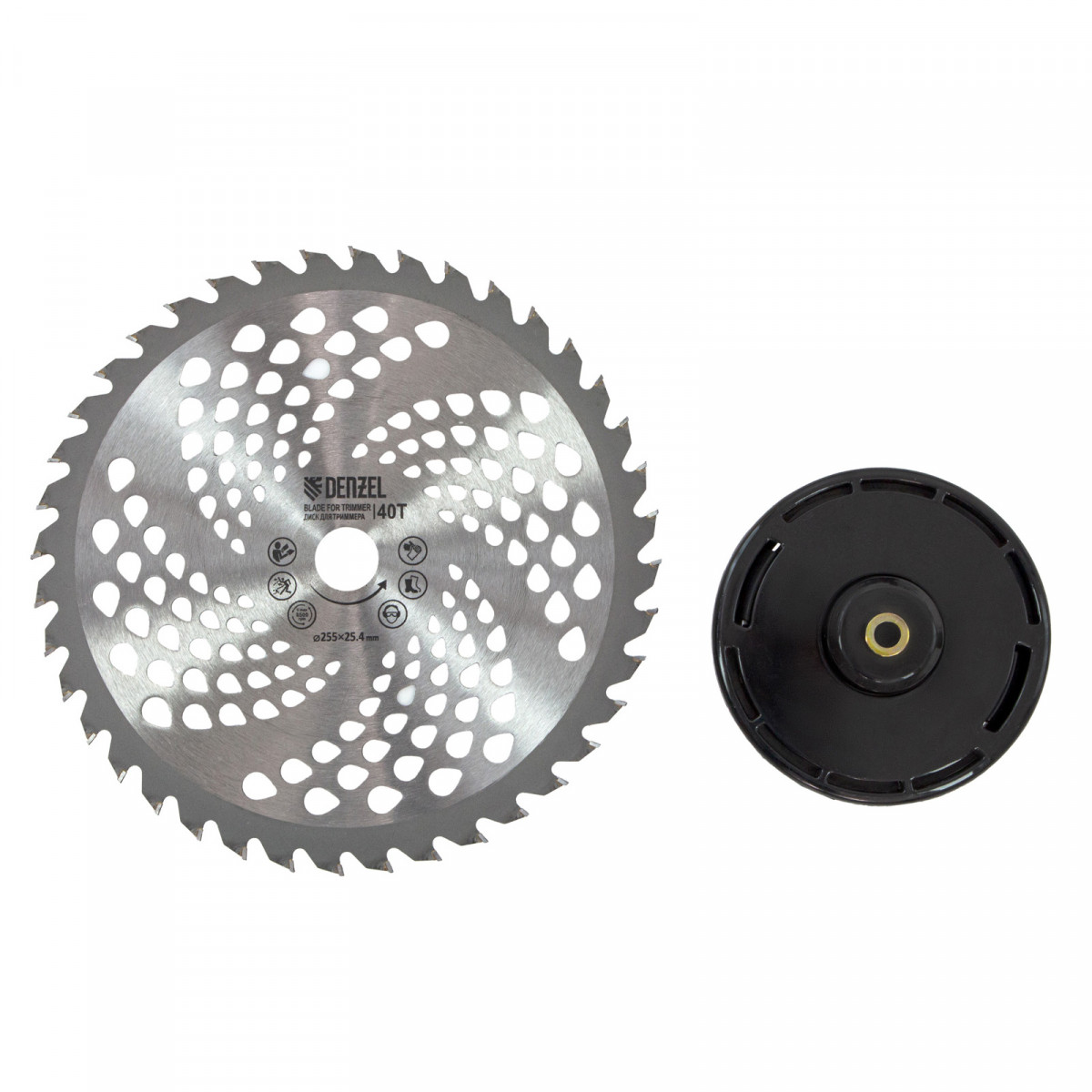 - Дополнительные возможности — можно приобрести и установить на триммер диски Denzel 96323, 96325 для быстрого удаления растительности с жесткими стеблями (полыни, крапивы, лебеды), 96328 для скашивания молодых побегов кустарника диаметром до 3 мм.