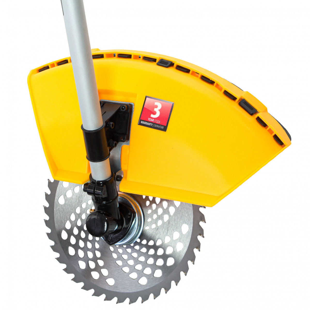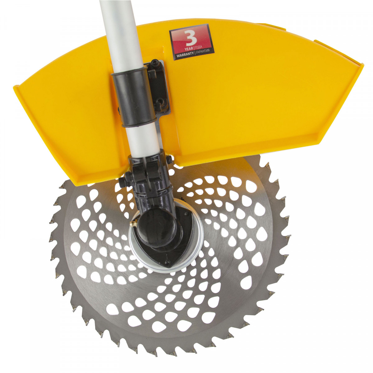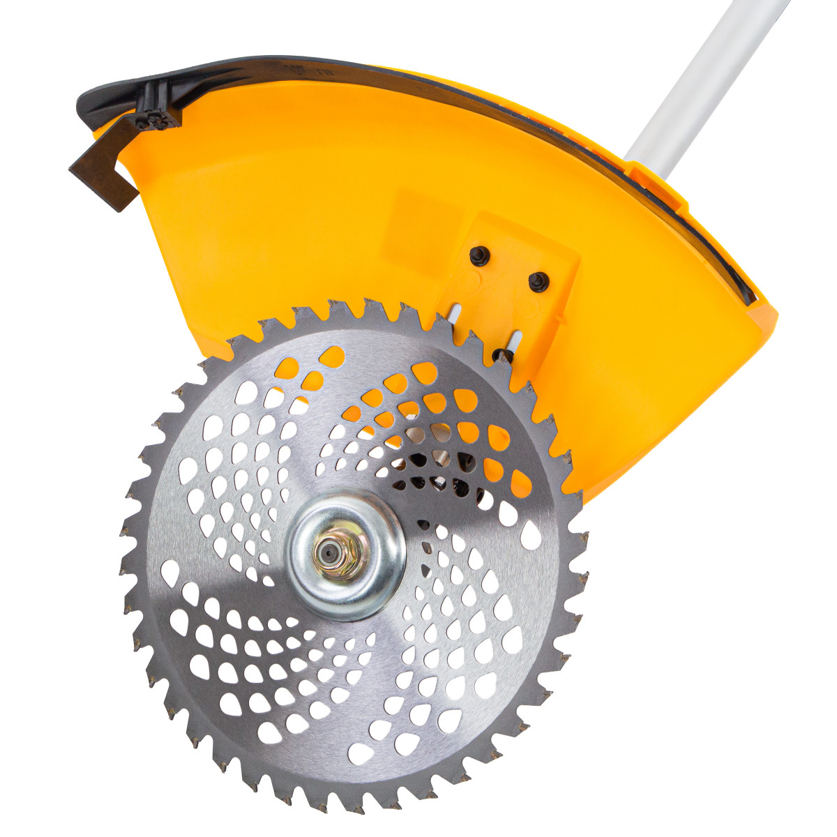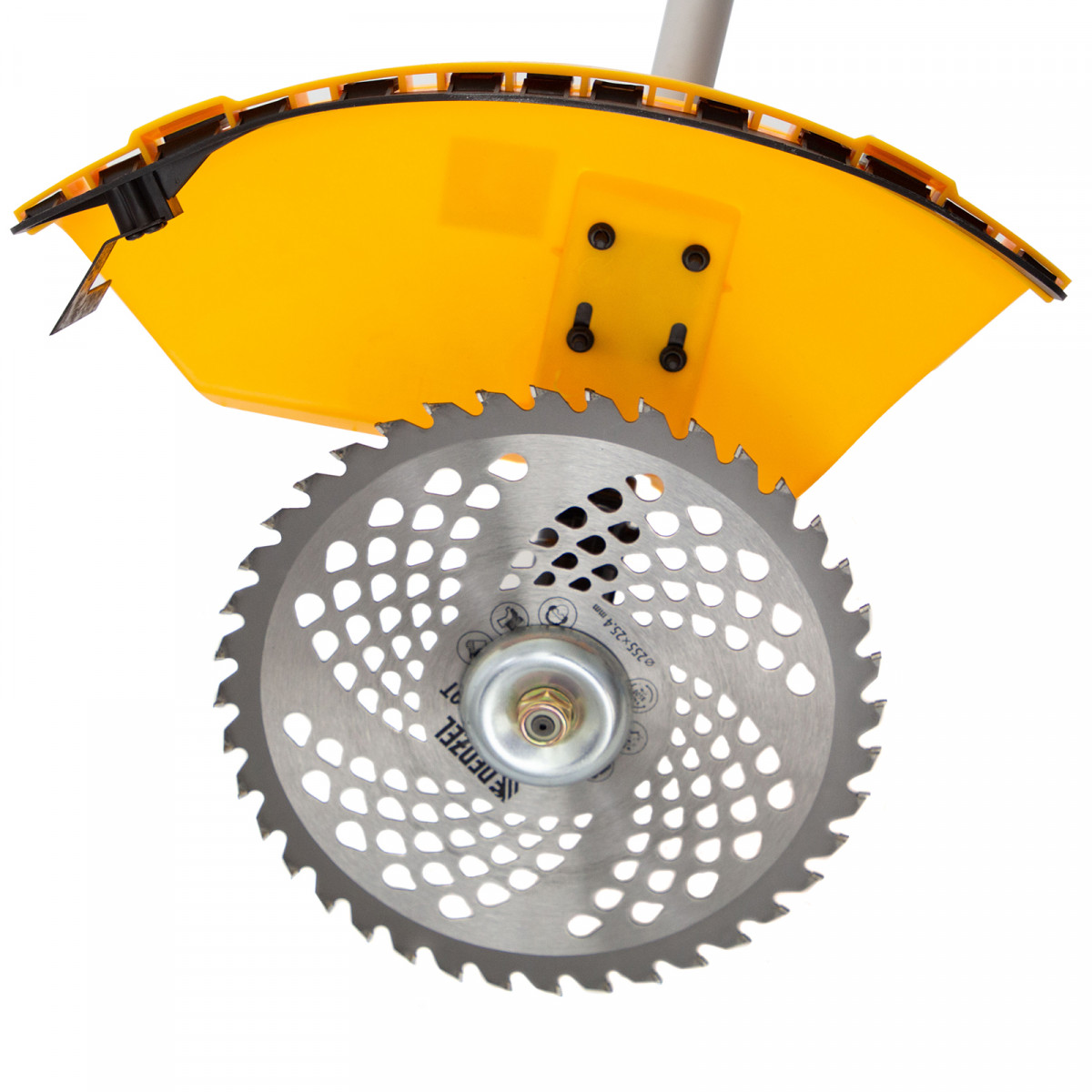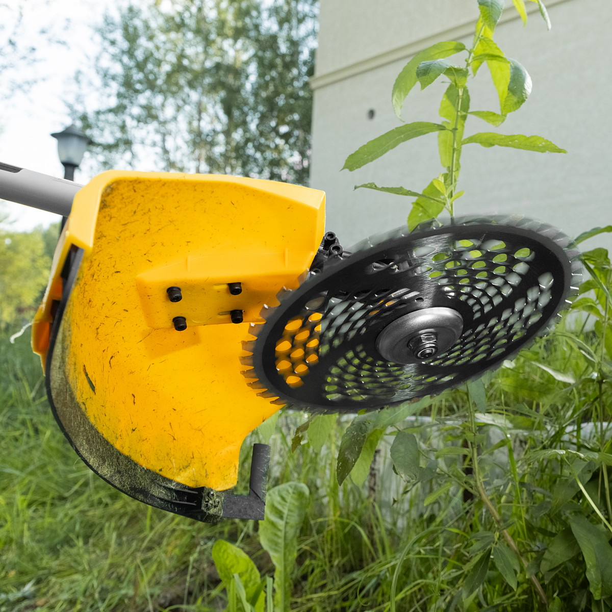 - Дополнительные возможности — можно приобрести и установить на триммер диски Denzel 96323, 96325 для быстрого удаления растительности с жесткими стеблями, 96328 для скашивания молодых побегов кустарника диаметром до 3 мм.