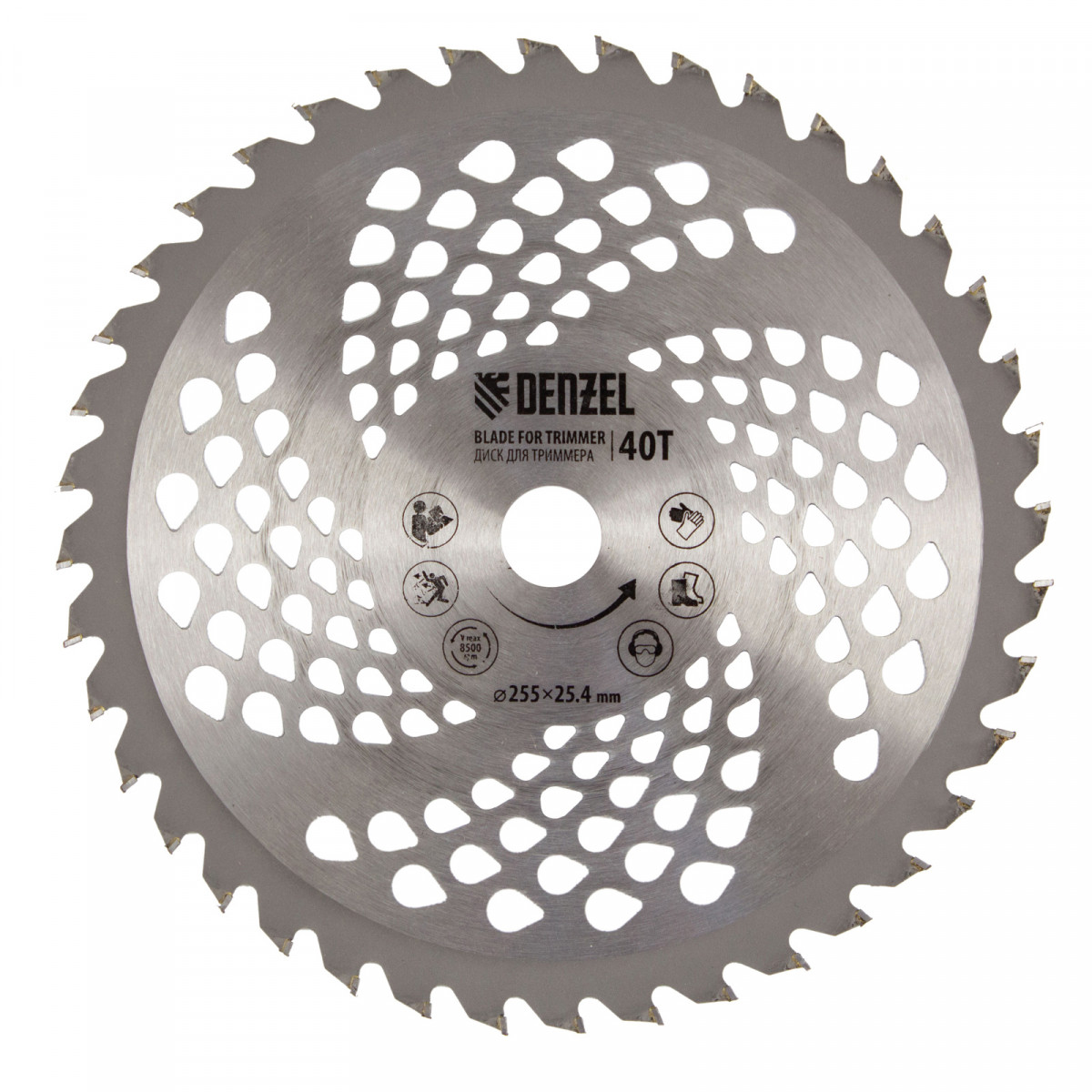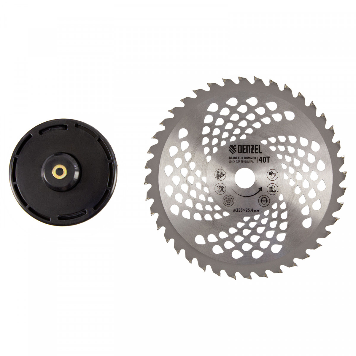 • Дополнительные возможности — можно приобрести и установить на триммер диски Denzel 96323, 96325 для быстрого удаления растительности с жесткими стеблями, 96328 для скашивания молодых побегов кустарника диаметром до 3 мм.