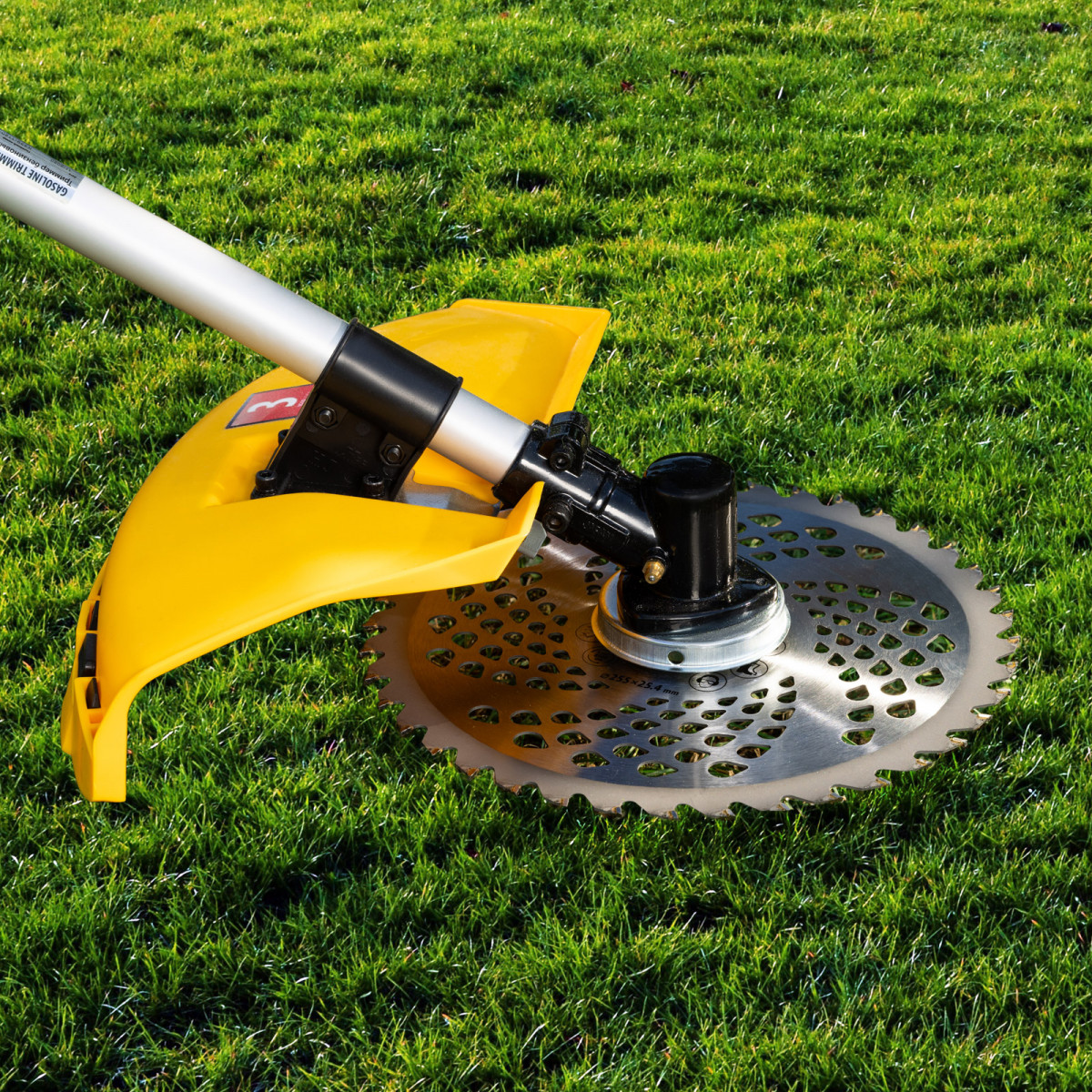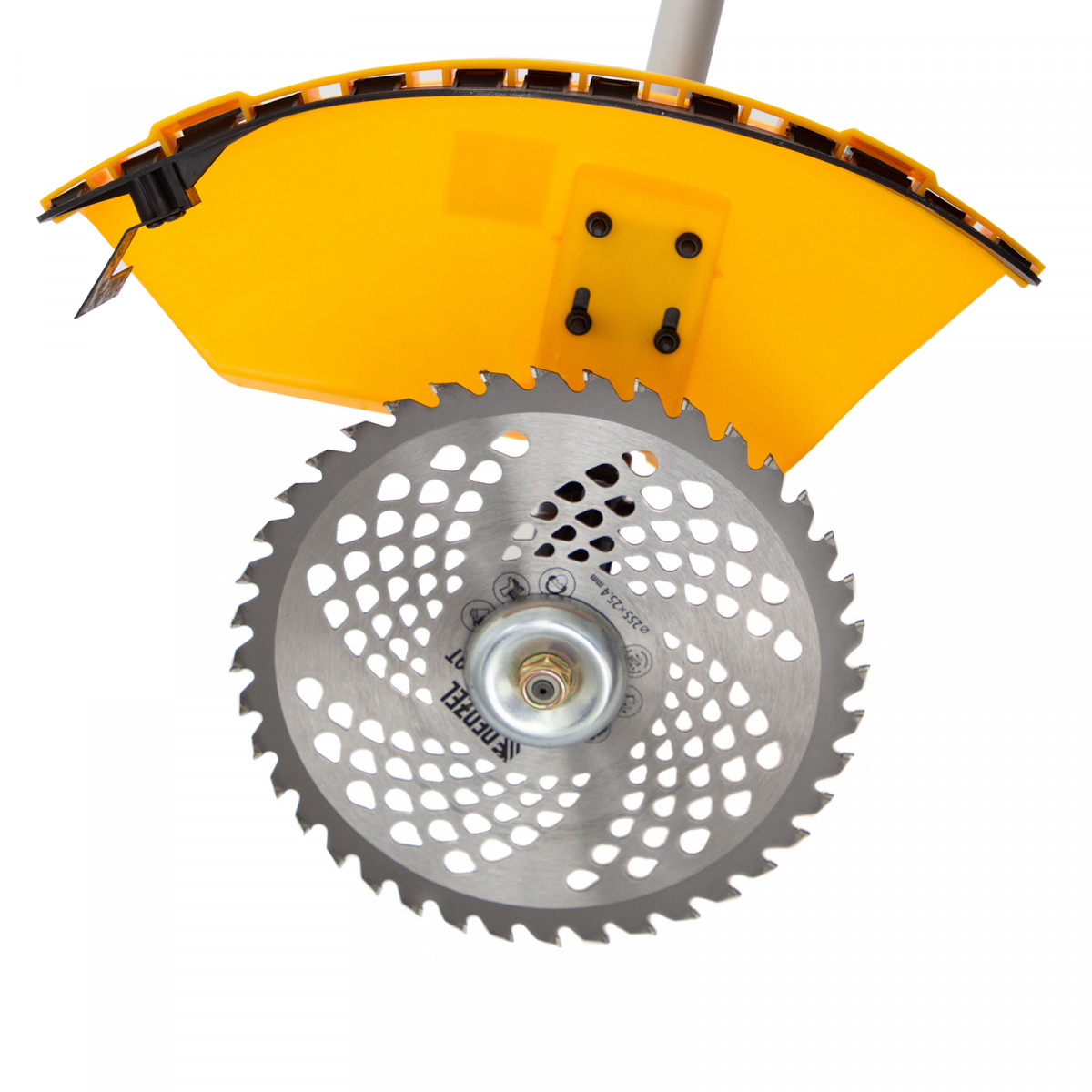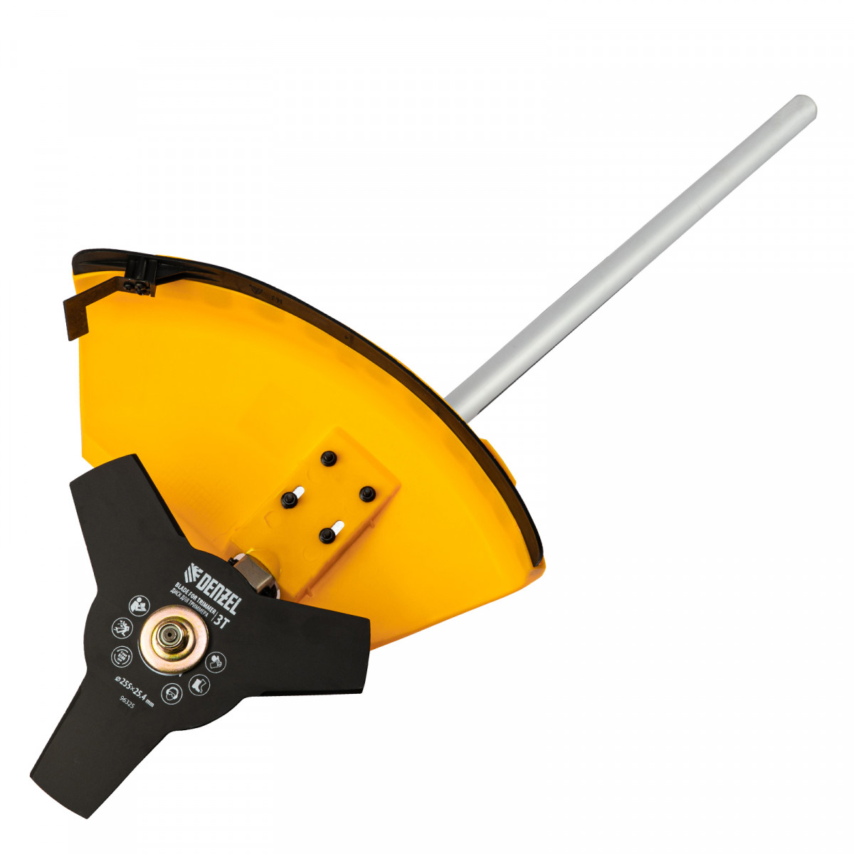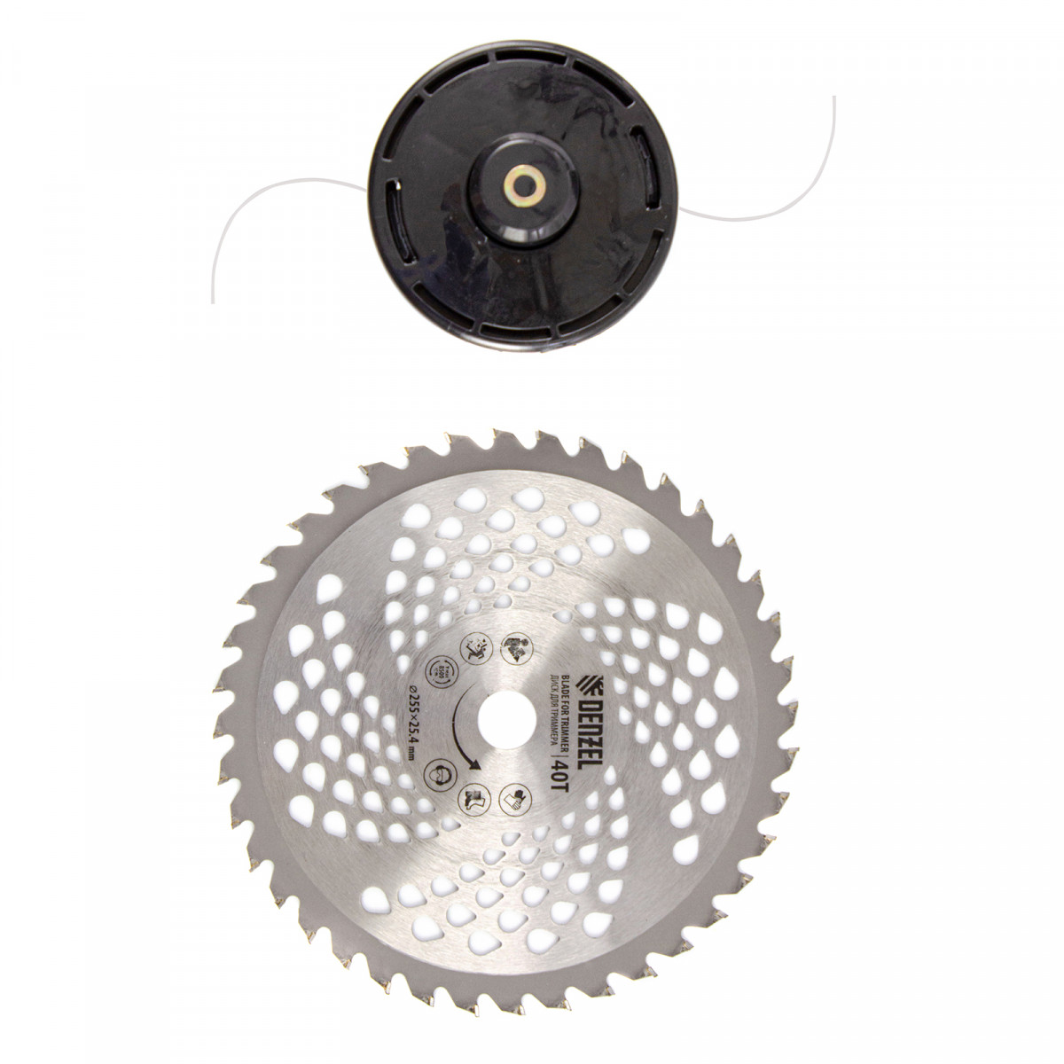 - Дополнительные возможности — можно приобрести и установить на триммер диски Denzel 96323, 96325 для быстрого удаления растительности с жесткими стеблями (полыни, крапивы, лебеды), 96328 для скашивания молодых побегов кустарника диаметром до 3 мм.