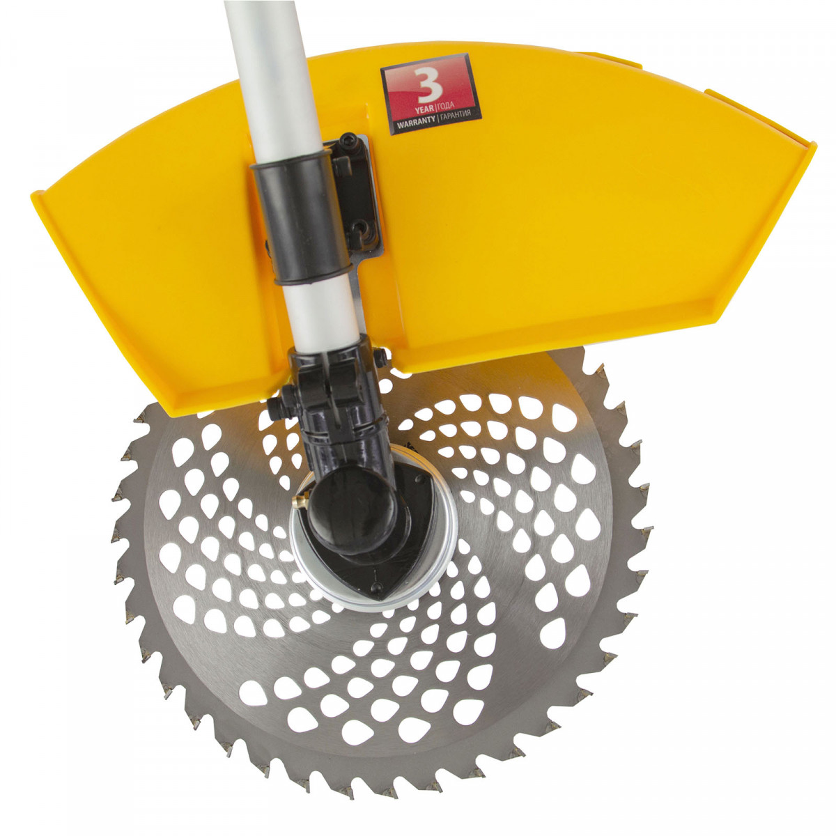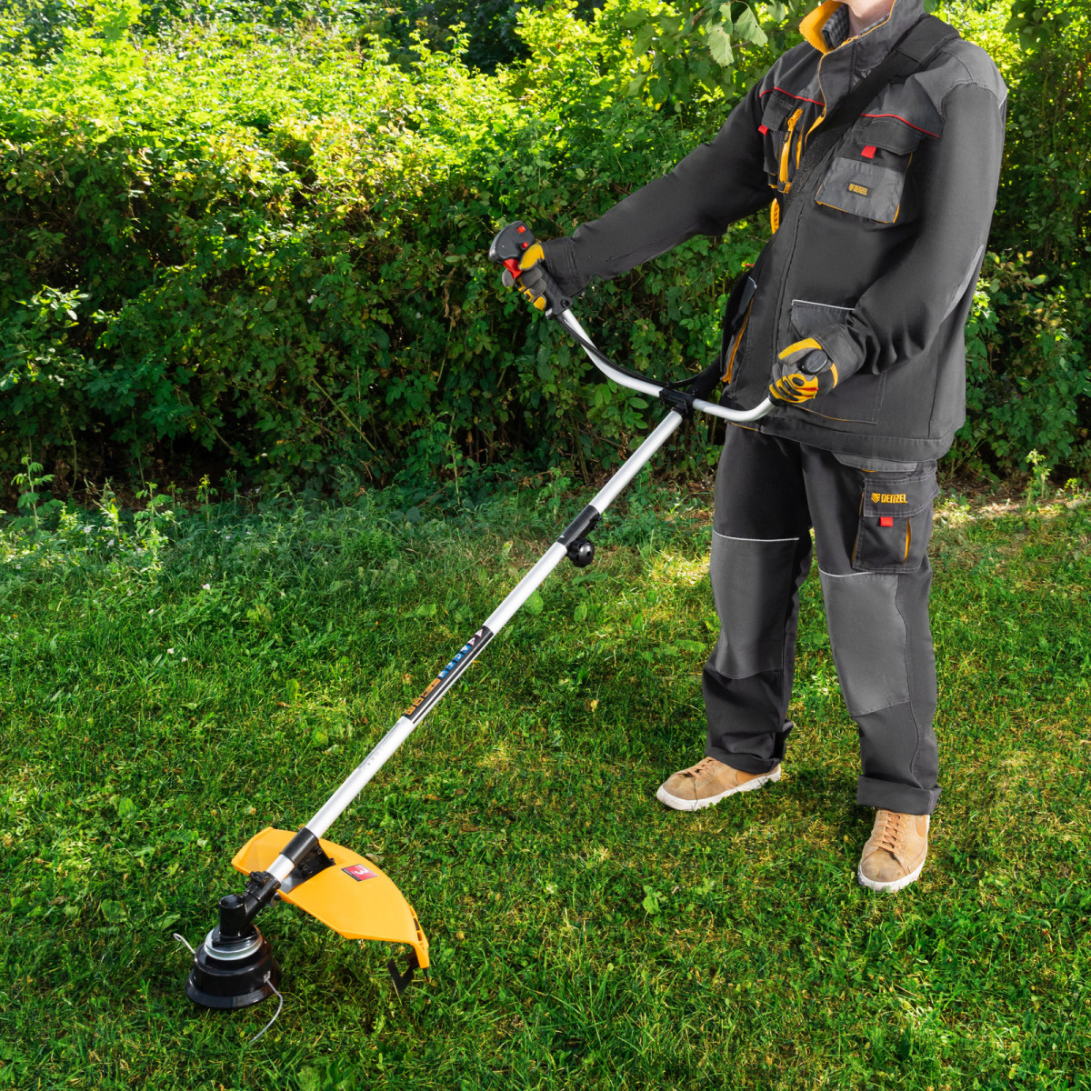 Бензиновый триммер Denzel DT-52S 96227 с двигателем мощностью 3 л.с. и объемом 52 см3, с разъемной штангой, поставляется комплектом из 2 частей и предназначен для скашивания травы всех типов, в том числе с жесткими древовидными стеблями — полыни, крапивы, лебеды, борщевика. Справляется также со срезанием кустарника и молодых побегов деревьев с диаметром стволов до 10 мм. Удобен для работы с мокрой травой и в труднодоступных местах. Ширина скашивания катушкой с леской составляет 420 мм, пильным диском — 255 мм. Испытаниями подтверждено — триммер способен работать до отказа 80 часов подряд.