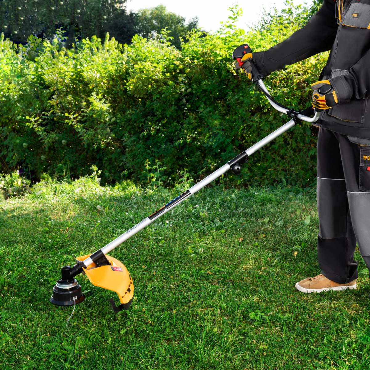 - Удобное хранение и транспортировка — штанга легко разбирается на 2 части, поэтому триммер не занимает много места.