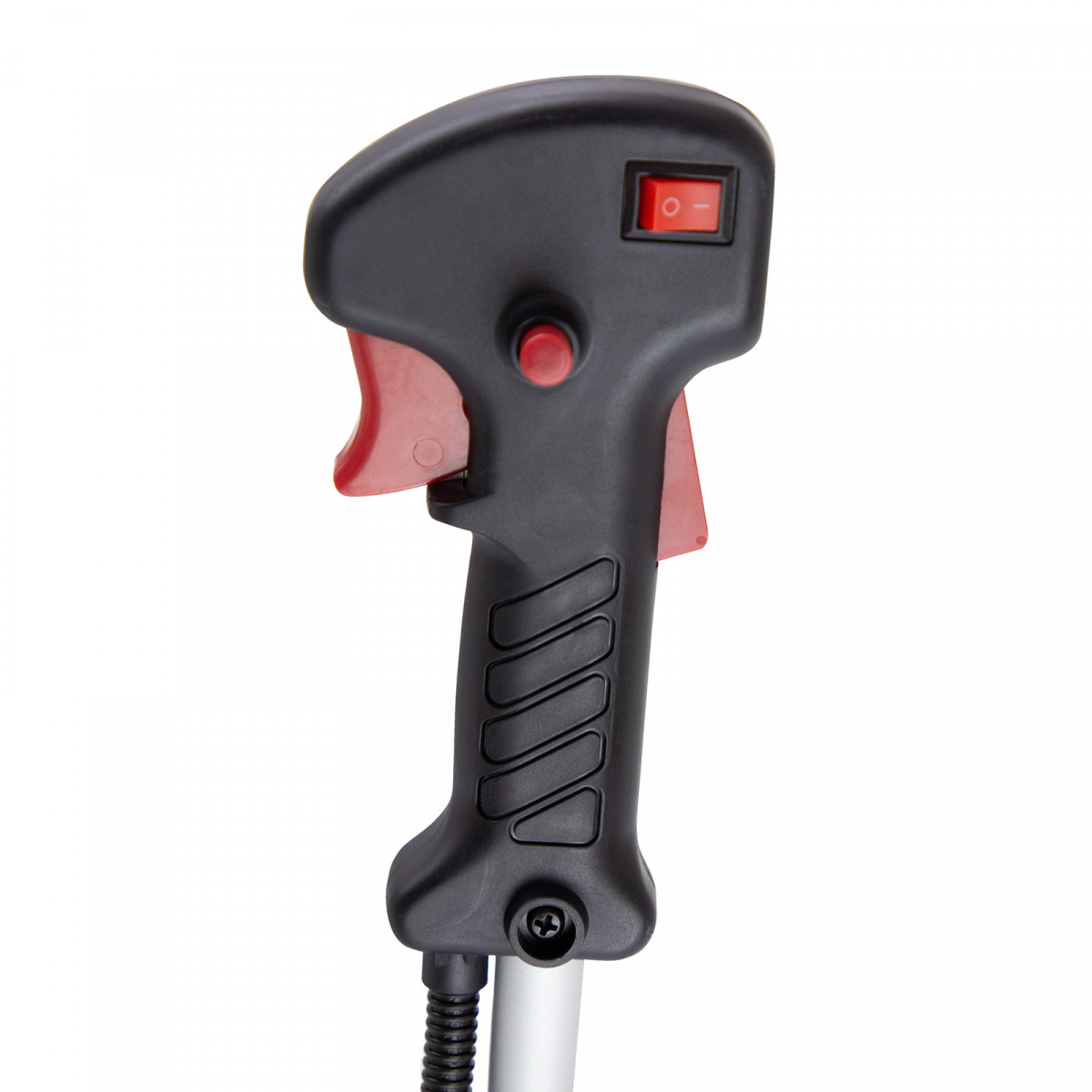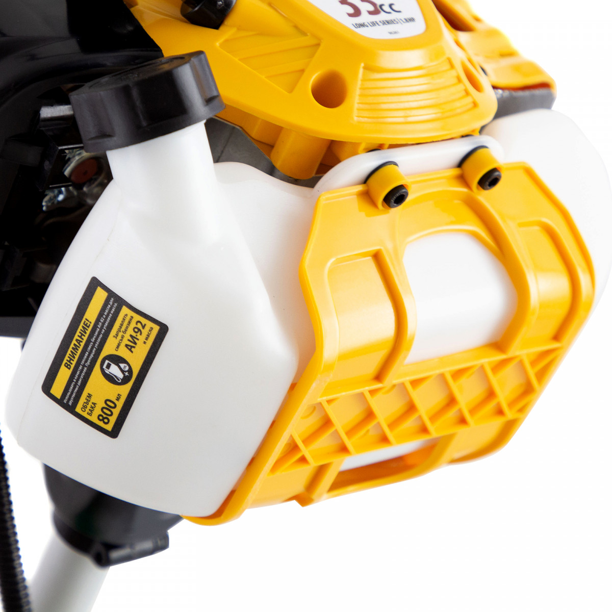 - Полуавтоматическая подача лески — увеличить длину корда можно легким ударом шпули о землю, при этом работу двигателя останавливать не придется.