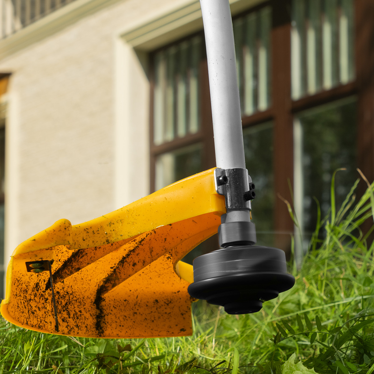 • Безопасность — блокировка выключателя препятствует случайному запуску, а защитный кожух предохраняет от летящей травы.