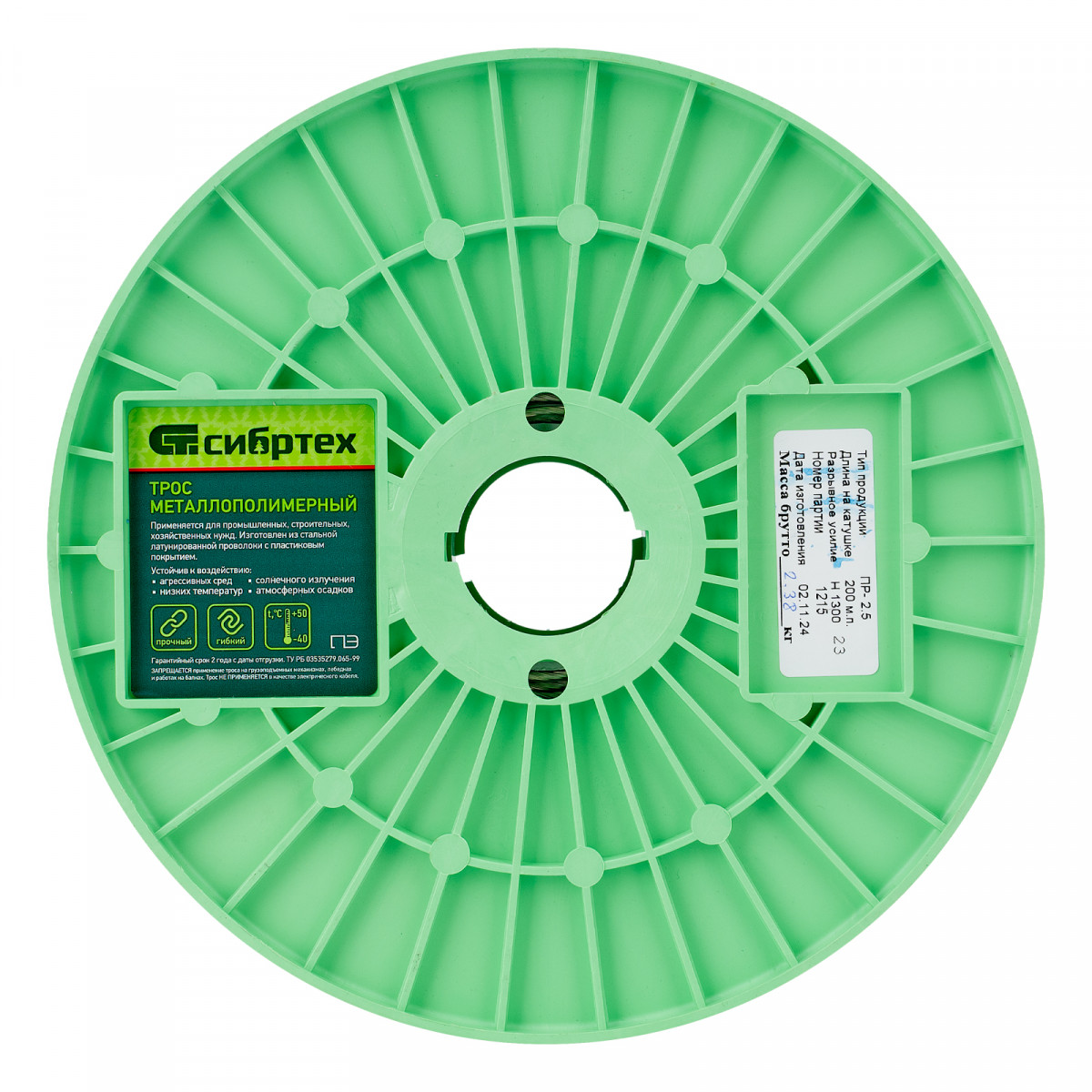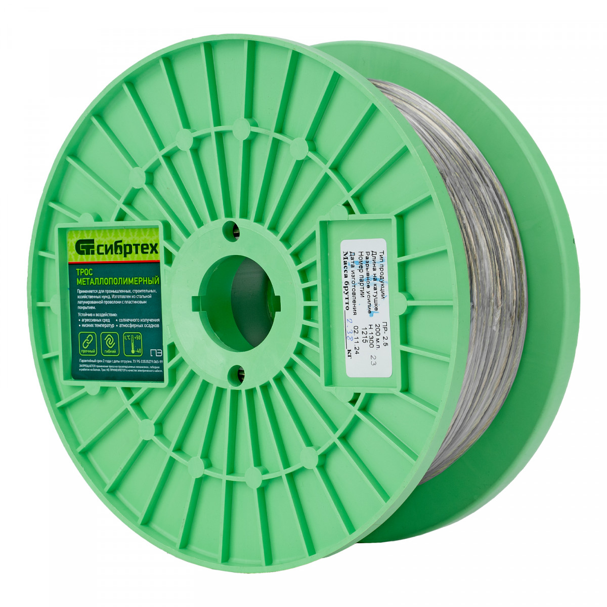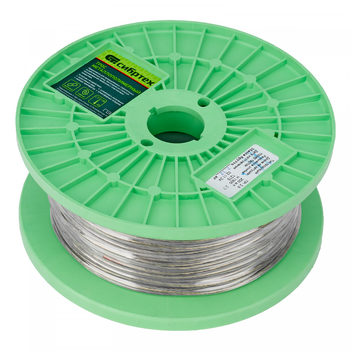 Металлополимерный прозрачный трос ПР-2.5 Сибртех 47626 толщиной 2,5 мм, 200 м. п. на катушке, используется для монтажа рекламных баннеров, установки ограждений, палаток, теплиц, погружения скважинных насосов и датчиков. Применяется в качестве садового троса-шнура для подвязки растений, а также может служить для развешивания белья. Жила шнура изготовлена из стальной проволоки, поэтому он выдерживает значительные нагрузки.