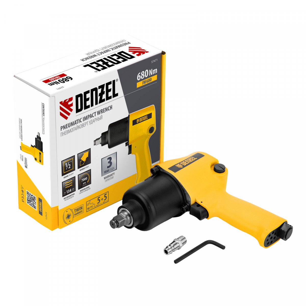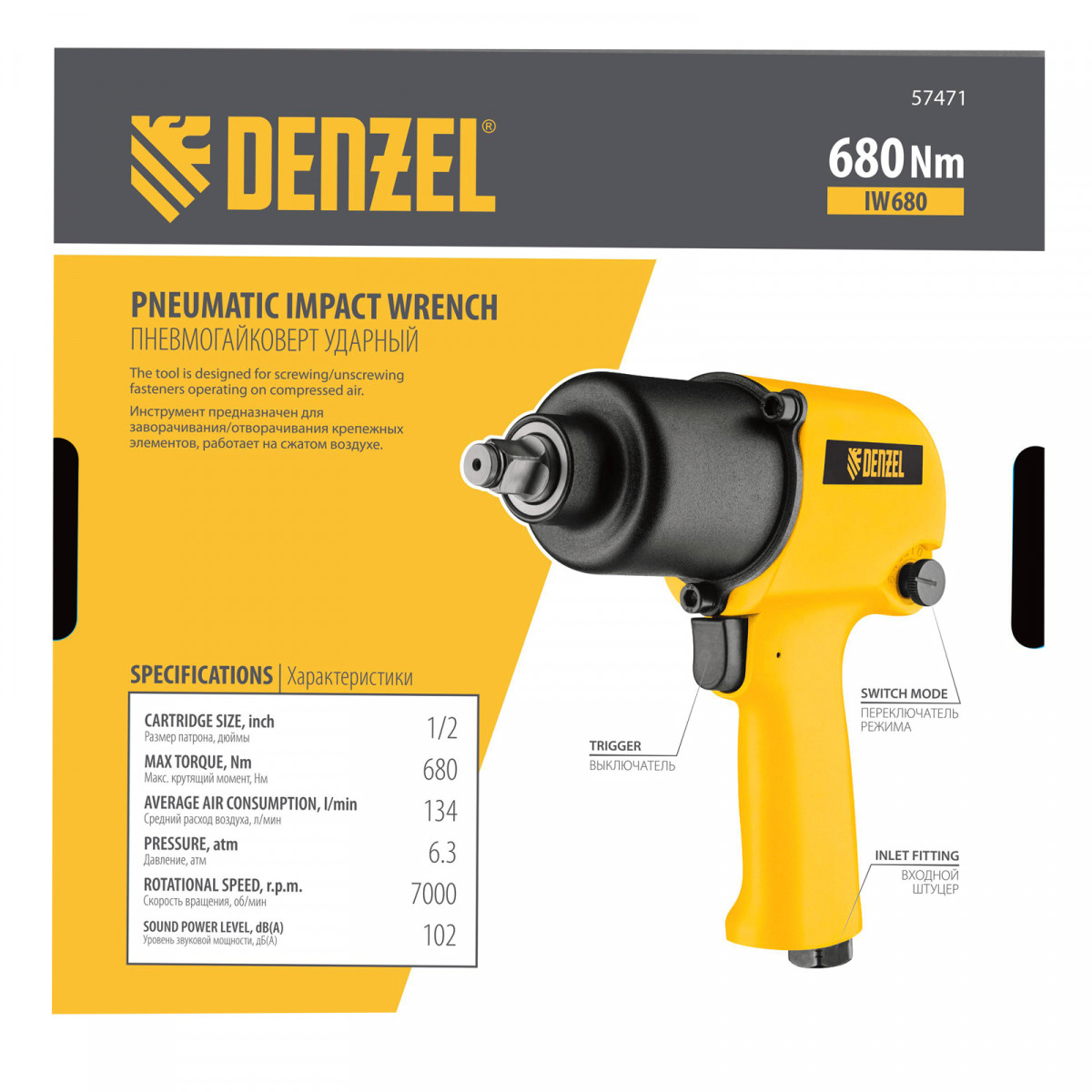 Ударный пневмогайковерт IW680, 1/2", 7000 об/мин, 680 Нм Denzel