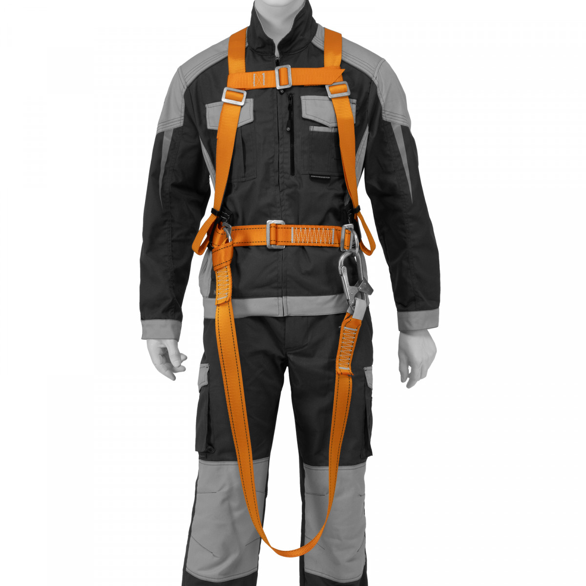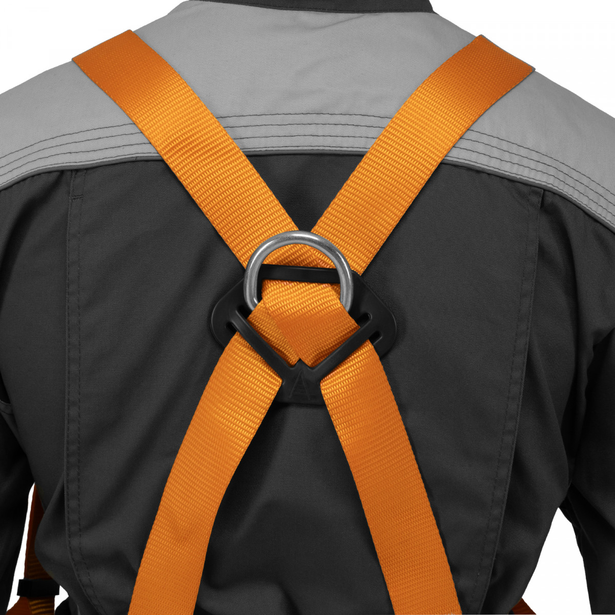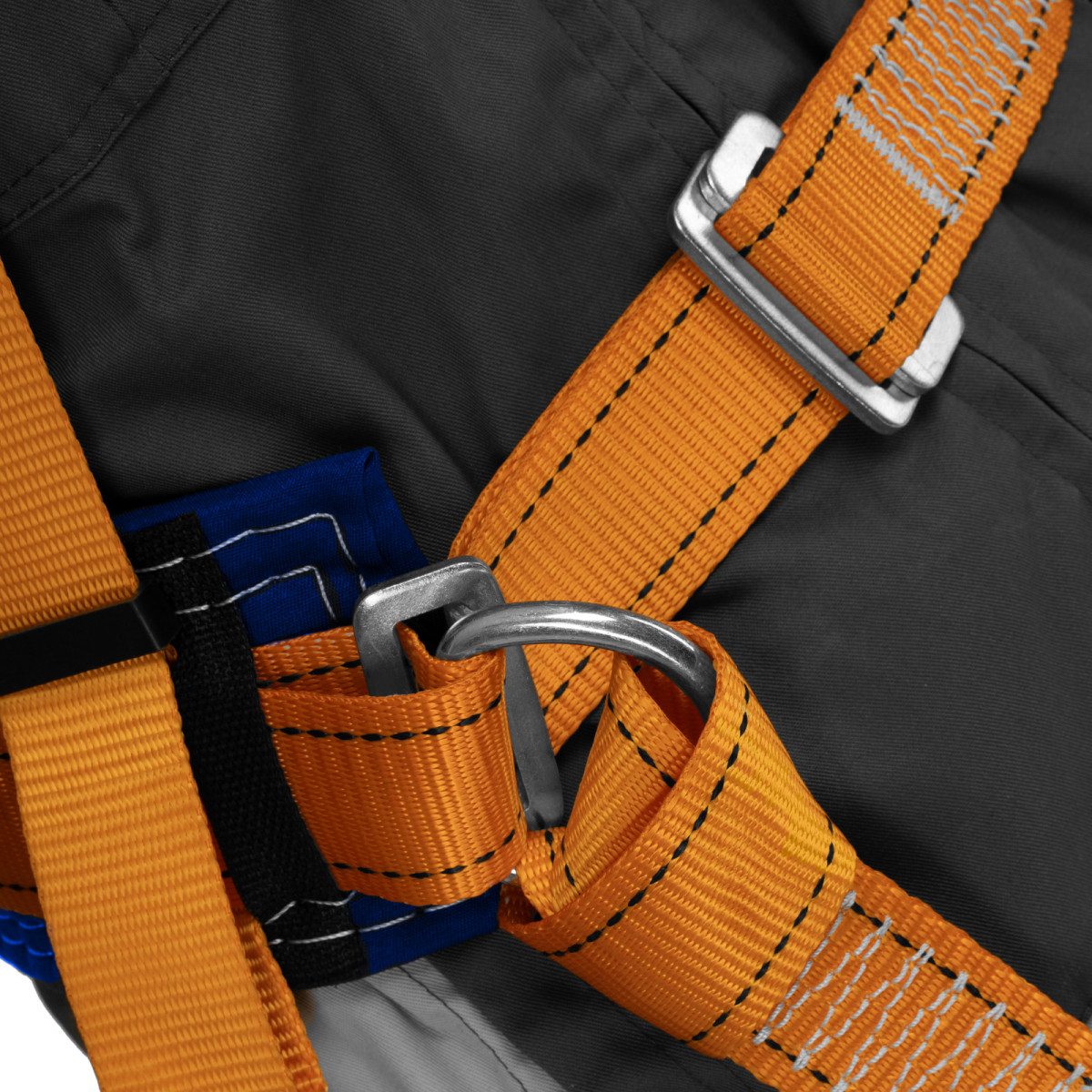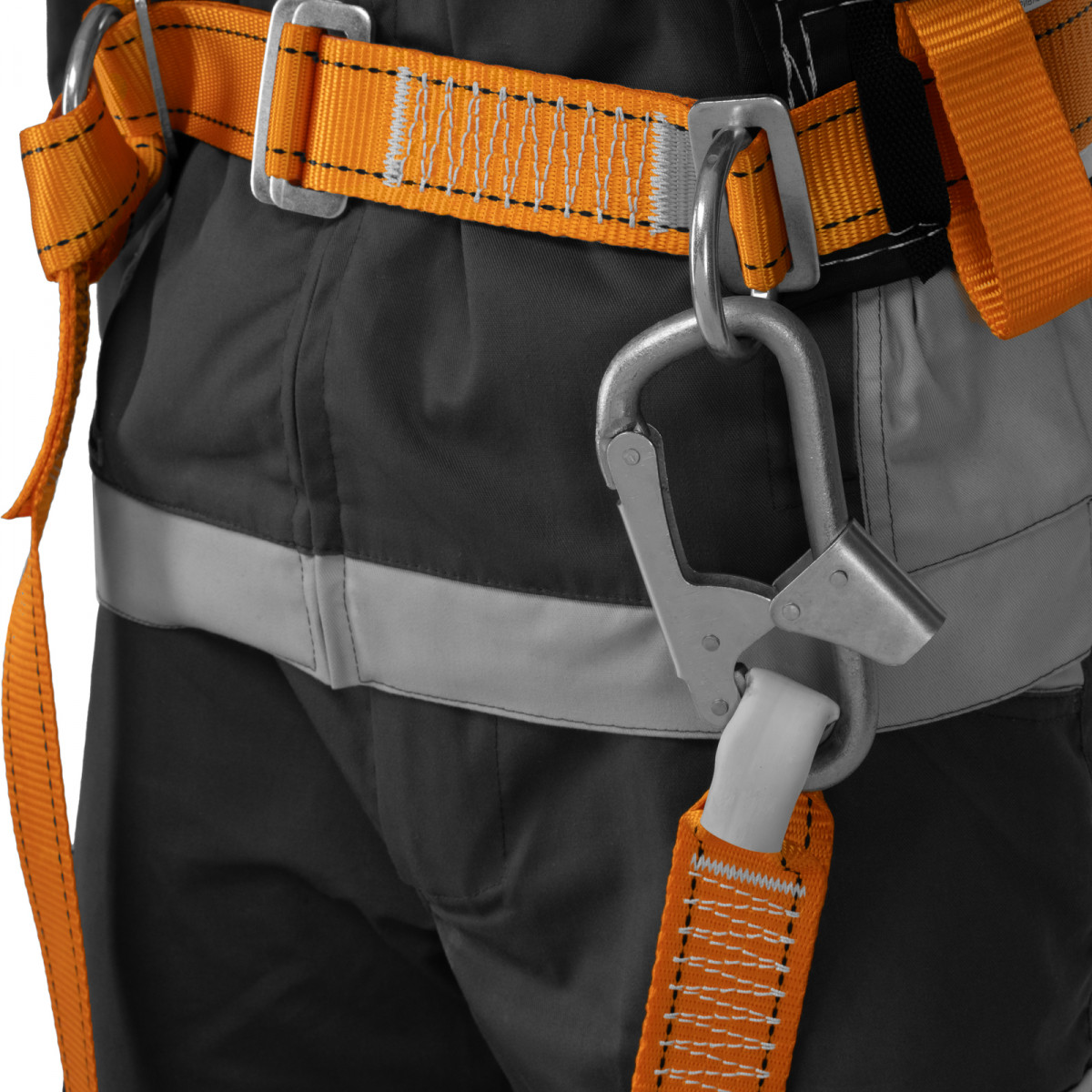 - Надежность — большой монтажный карабин, 2 металлических D-образных кольца на поясе и 1 на спине гарантированно удерживают пользователя.
