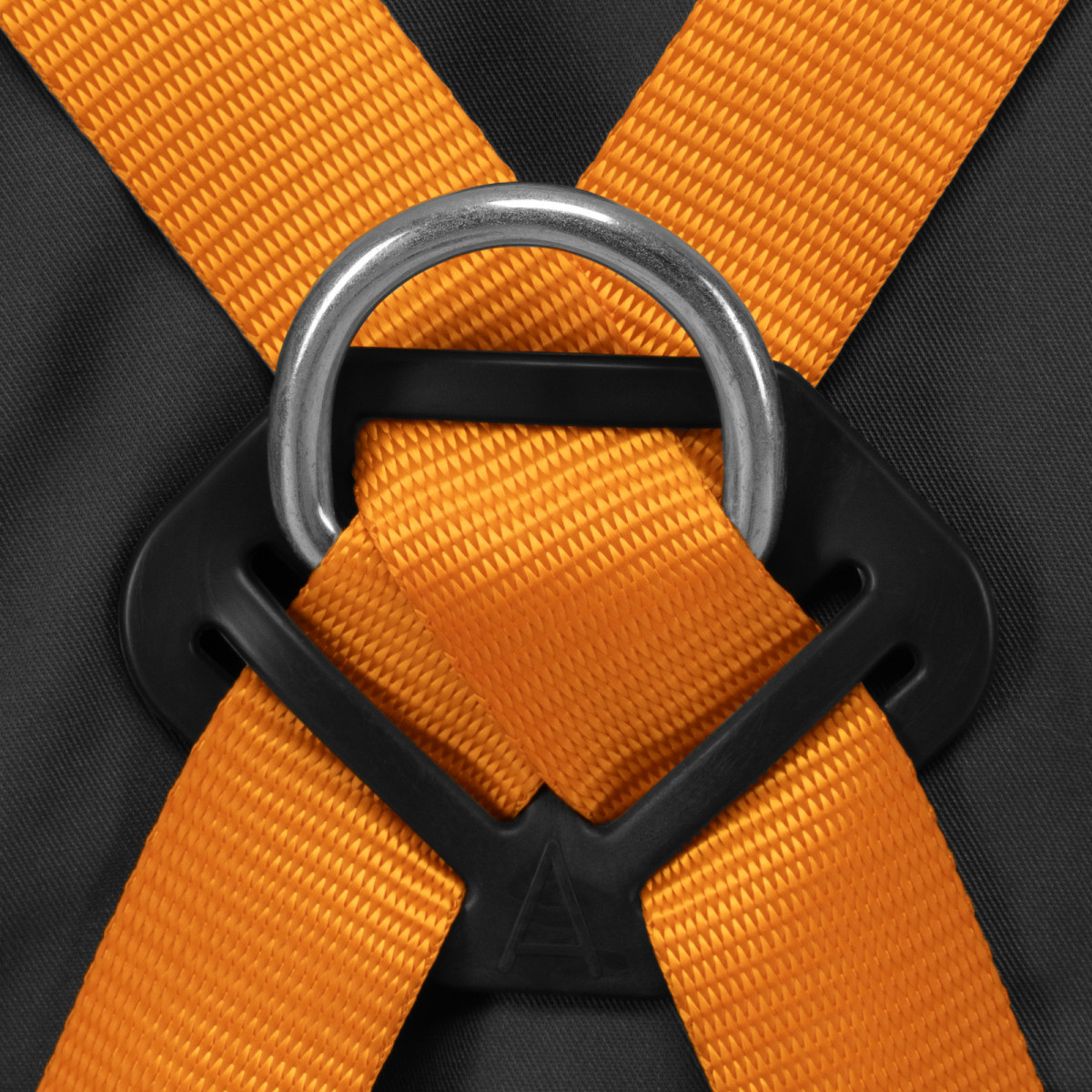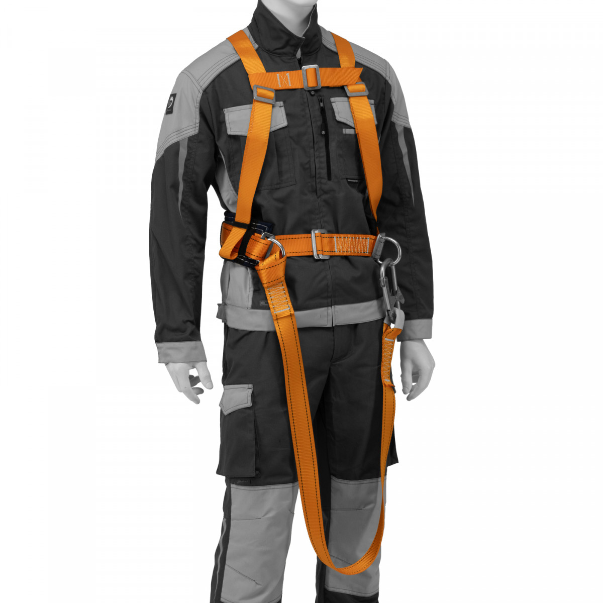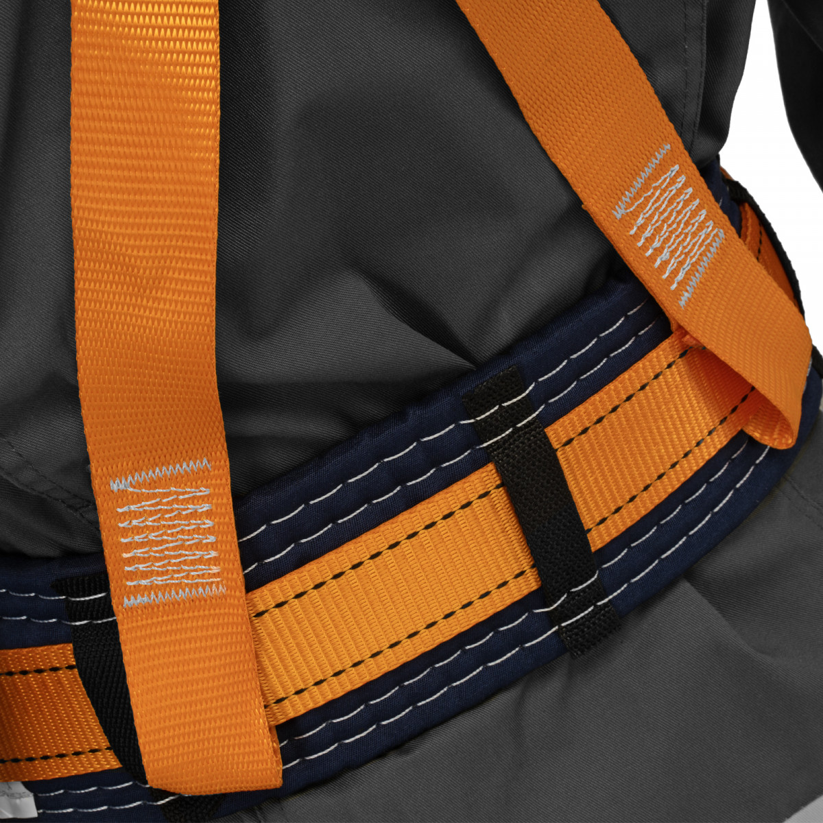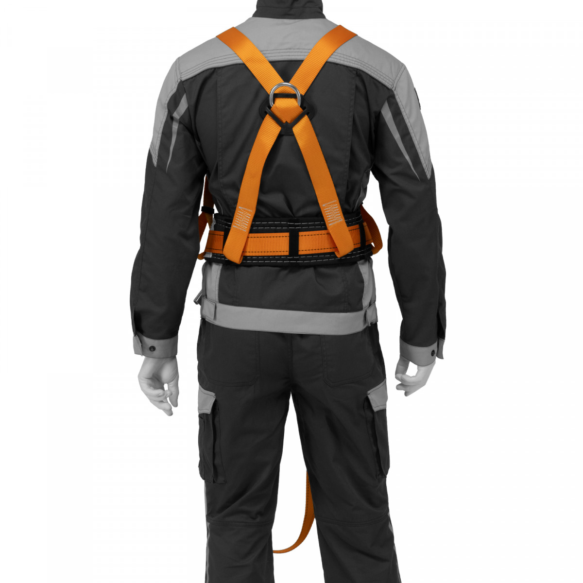 - Надежность — большой монтажный карабин, 2 металлических D-образных кольца на поясе и 1 на спине гарантированно удерживают пользователя.