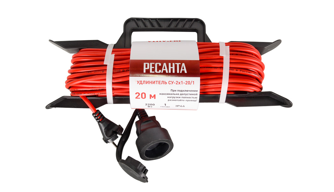 Мощность провода Ресанта СУ-2х1-20/1 составляет 2,2 кВт, поэтому можно подключать триммер, перфоратор, болгарку или другой электроинструмент. При использовании удлинителя в смотанном виде мощность подключённых приборов не должна превышать 1,1 кВт, иначе провод будет греться, что может привести к его деформации.