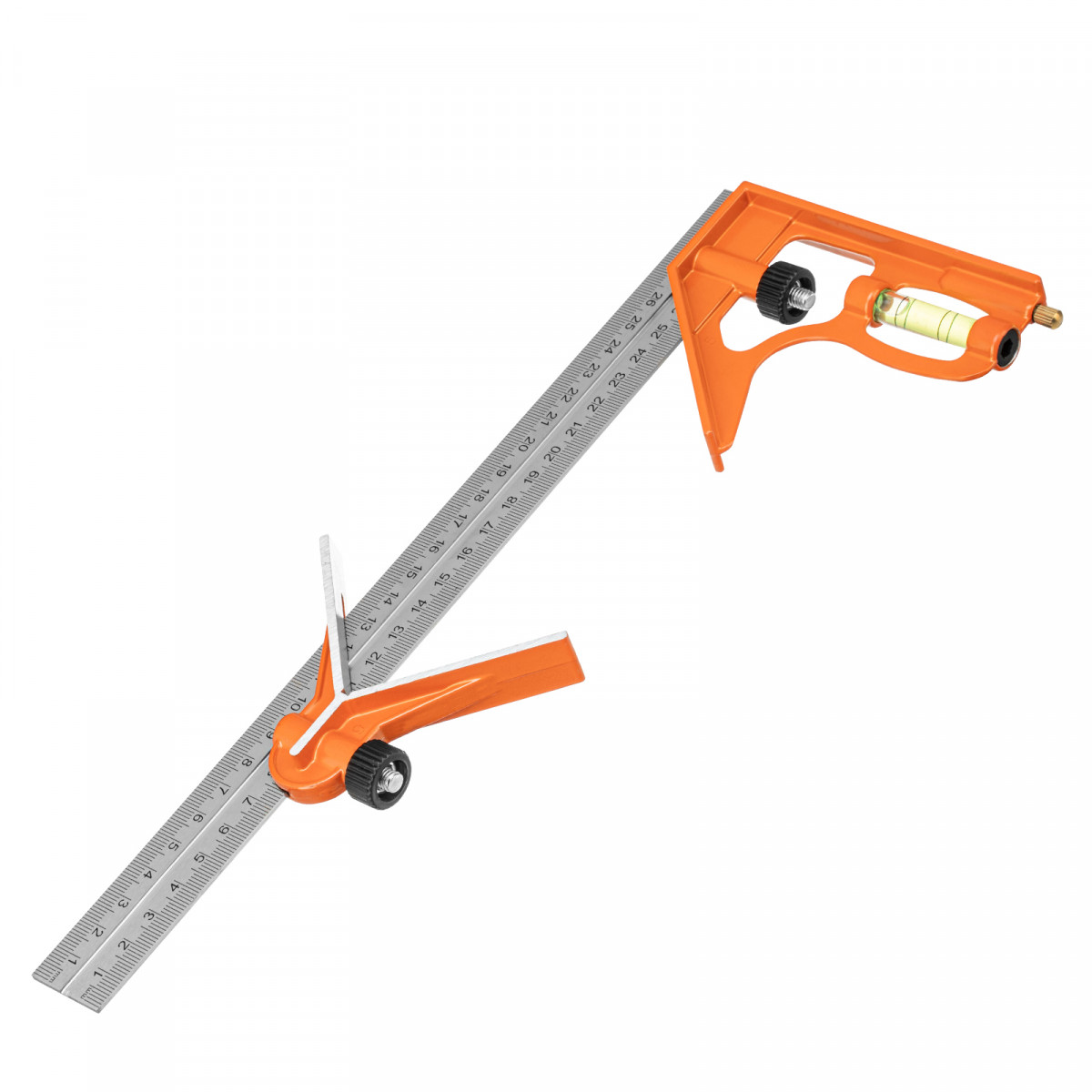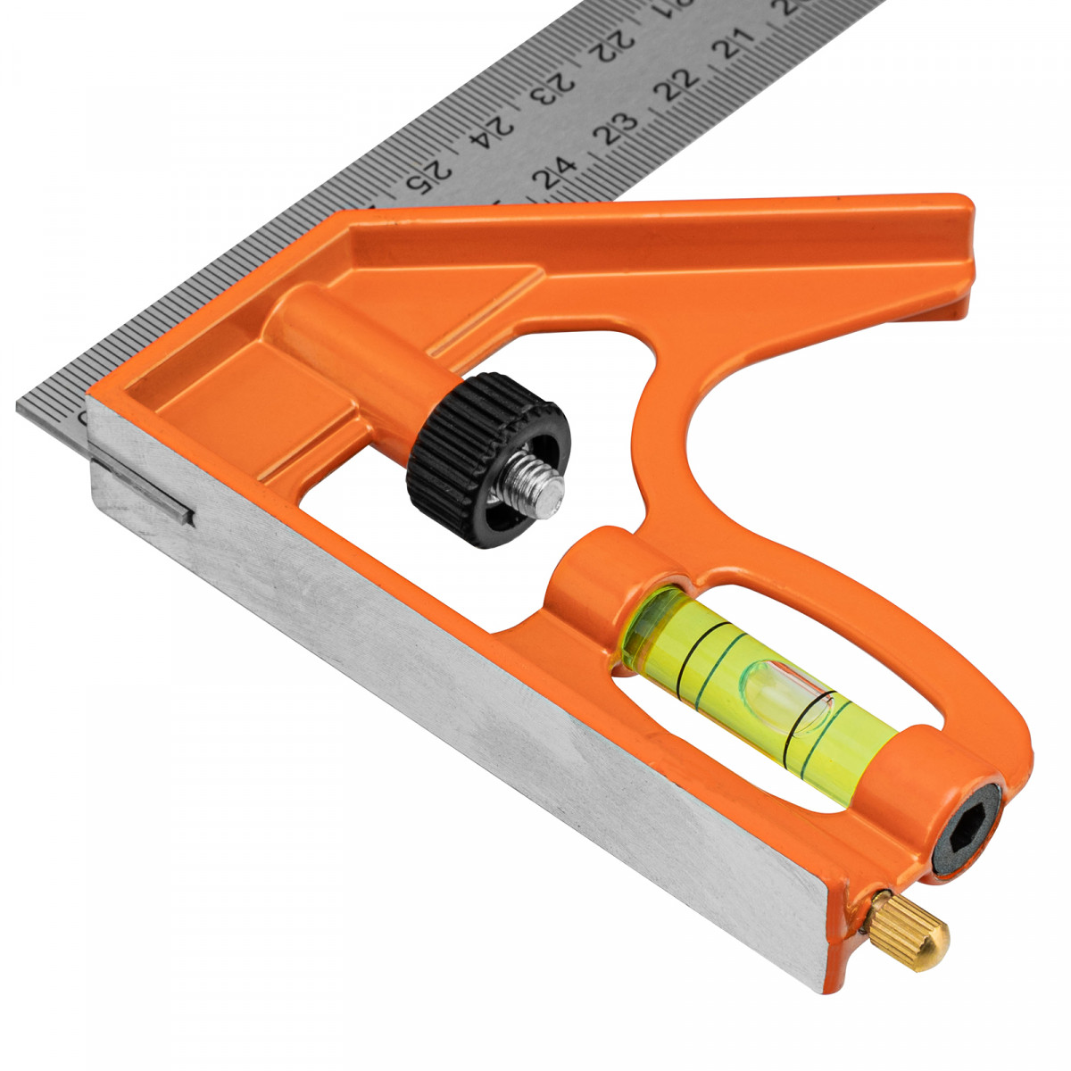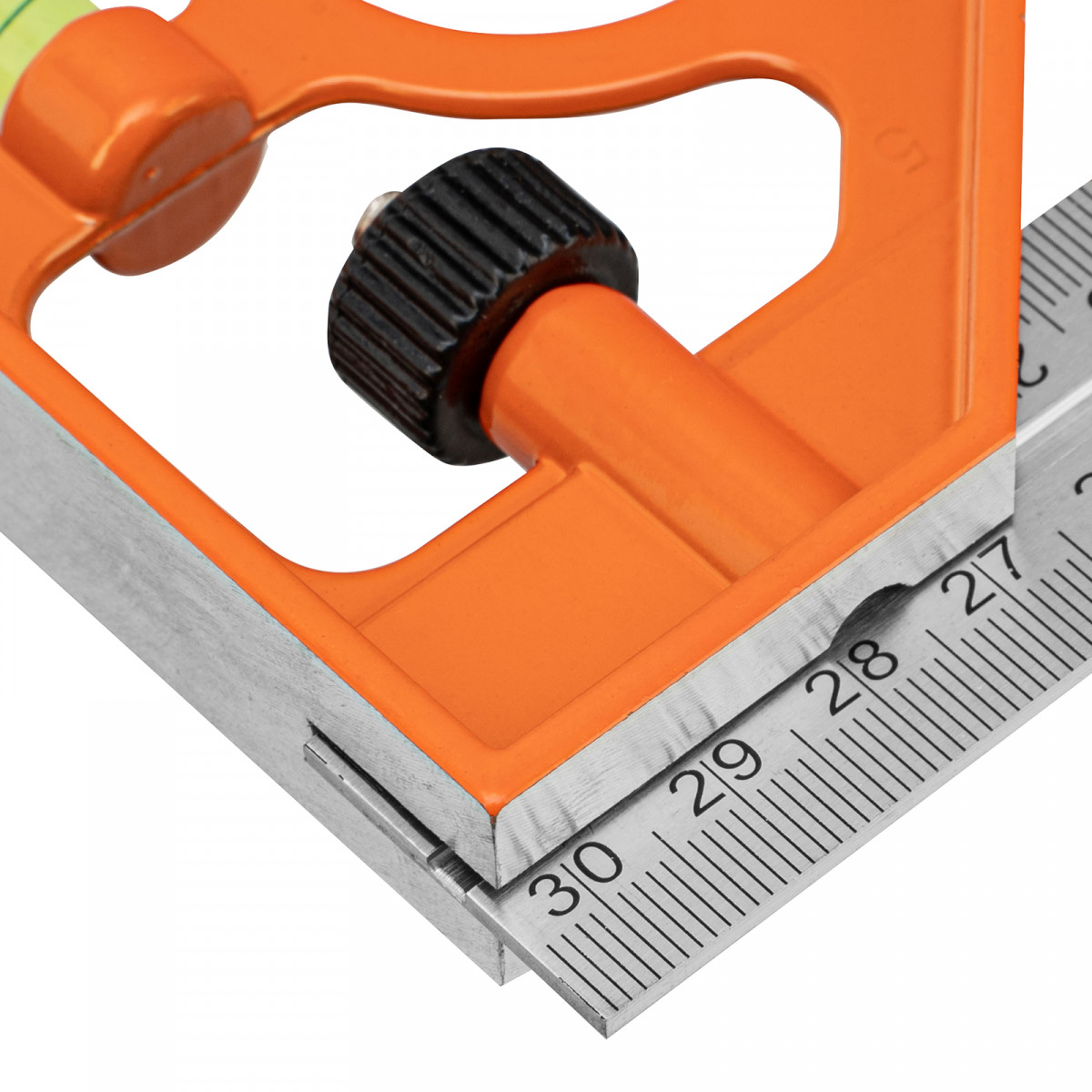 Комбинированный металлический угольник Sparta 323675 длиной 300 мм используется для разметки поверхностей и проверки точности углов 45° и 90°. Пригодится для выполнения столярных работ, а также для плоскостного контроля во время строительства.