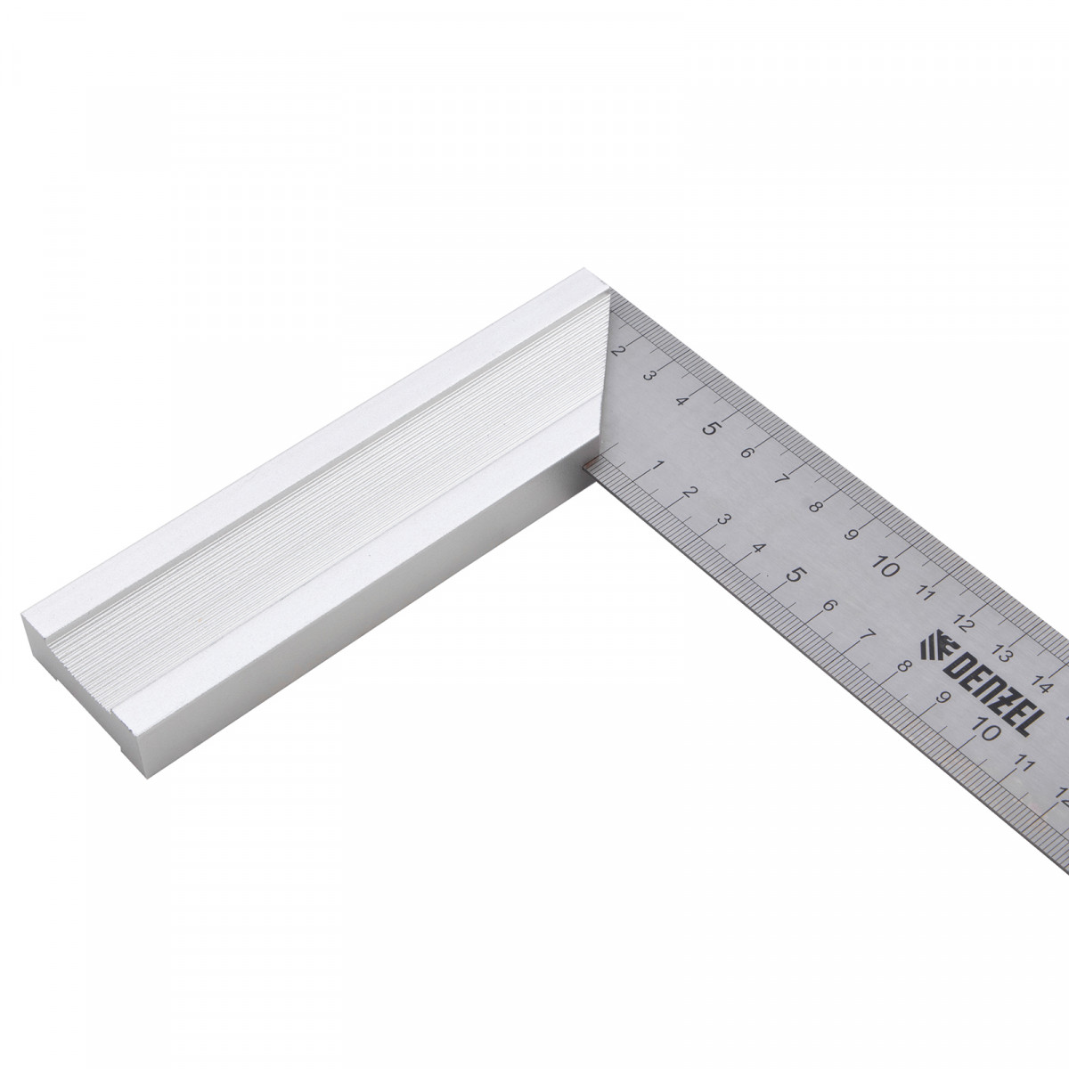 Стальной угольник Denzel 32397 длиной 300 мм, с градуировкой, алюминиевым основанием и полотном из нержавеющей стали, используется для построения и контроля углов. Будет полезен для выполнения столярных и строительных работ.