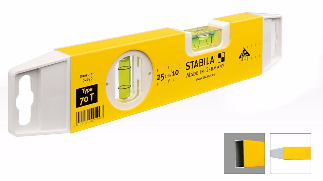 Уровень тип 70Т, 25 см STABILA 02199 благодаря небольшим размерам удобен для проведения измерений и выверки поверхностей в стесненных условиях. Позволяет отслеживать отклонения конструкции как по вертикали, так и по горизонтали. Профиль выполнен из легкого металла, порошковое покрытие повышает срок службы.