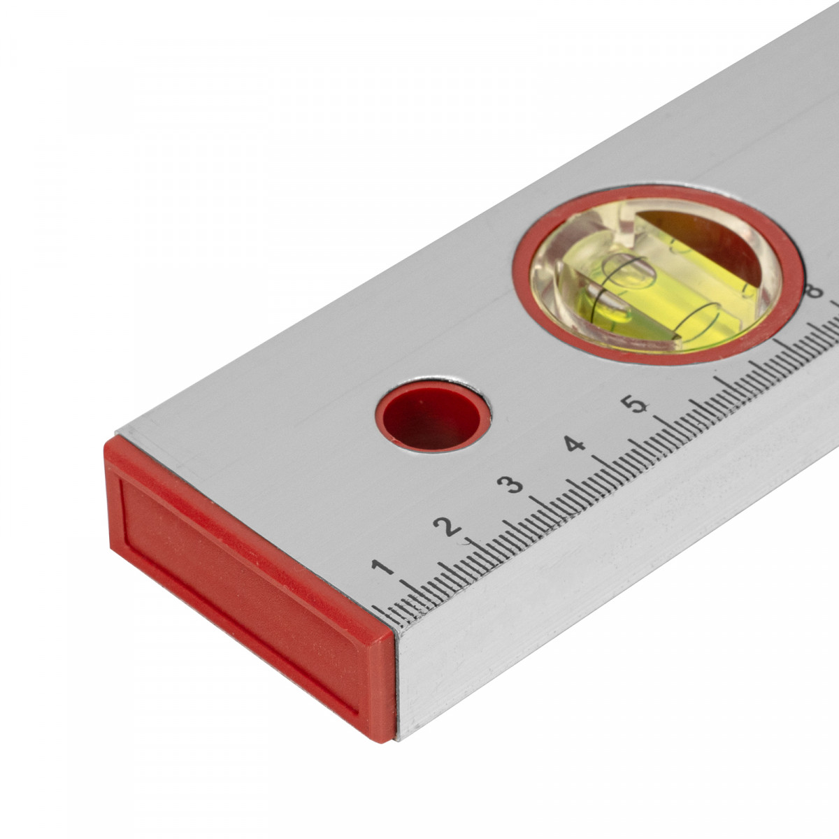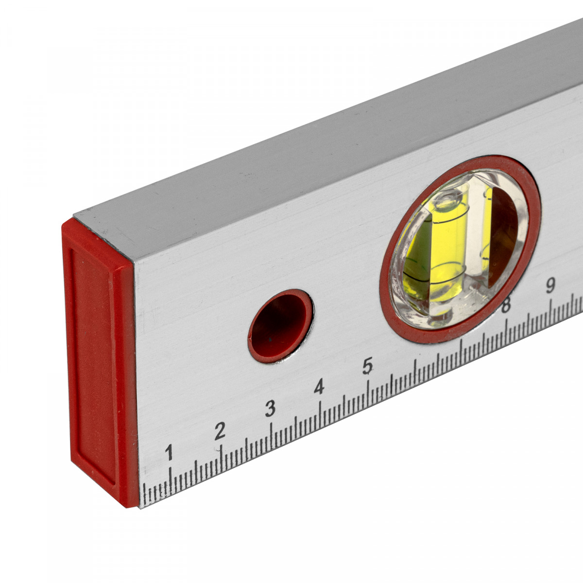 Алюминиевый уровень Sparta 35110 длиной 1000 мм, с 2 глазками и линейкой, рассчитан на применение в быту и в производственных условиях. Он поможет добиться точного выстраивания разметочных линий для последующей установки конструкций, полок, укладки облицовочных материалов и т.д. Две пузырьковые ампулы обеспечивают точный контроль отклонений поверхностей от горизонтальной и вертикальной плоскостей.,Для определения отклонения вертикали 90 градусов необходимо использовать пузырьковую ампулу только в верхнем положении уровня. Только базовая поверхность является рабочей (противоположная ампуле 180 градусов).