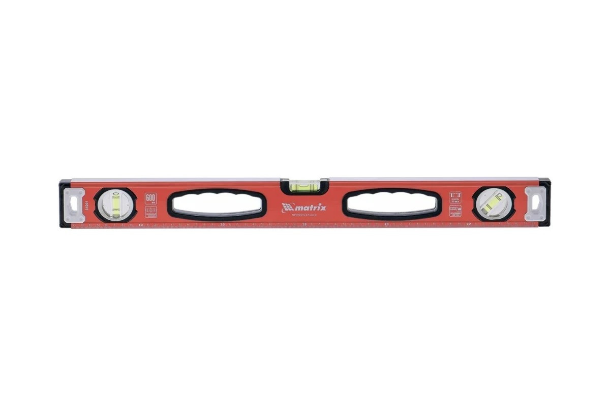 Алюминиевый фрезерованный уровень Matrix 34206 длиной 2000 мм, с 3 глазками и рукоятками, позволяет найти отклонения от вертикали и горизонтали, а также выставить диагональ.