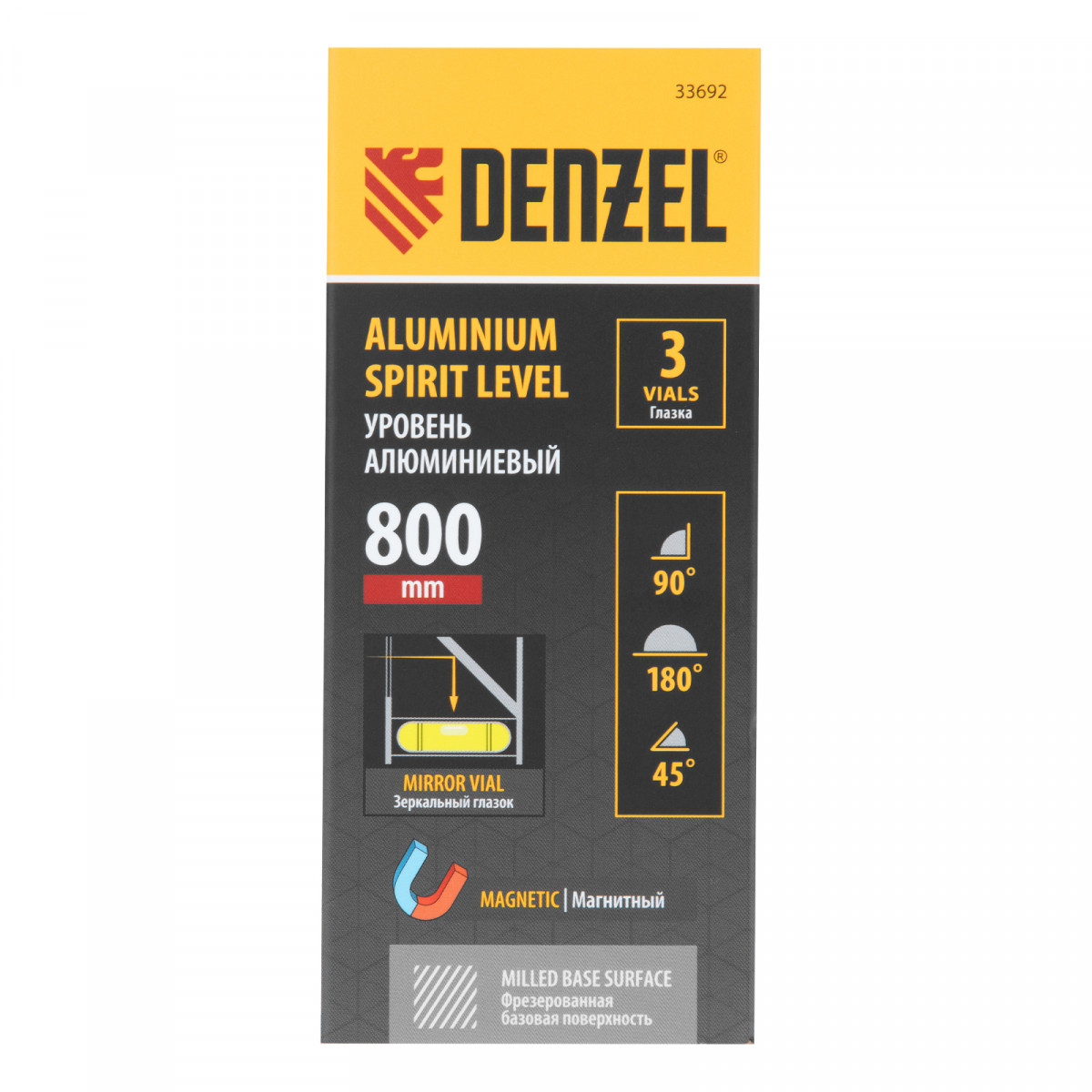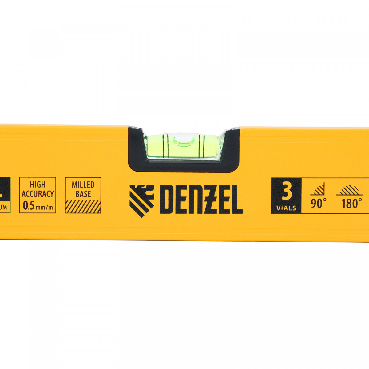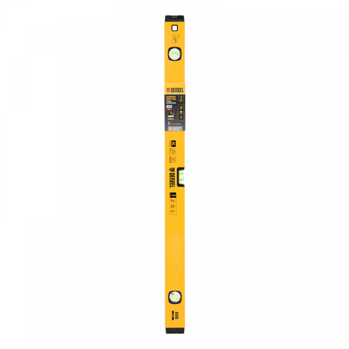 Уровень алюминиевый, магнит, фрезерованный, 3 глазка (1 зеркал.) 0,5 мм/м, 800 мм Denzel