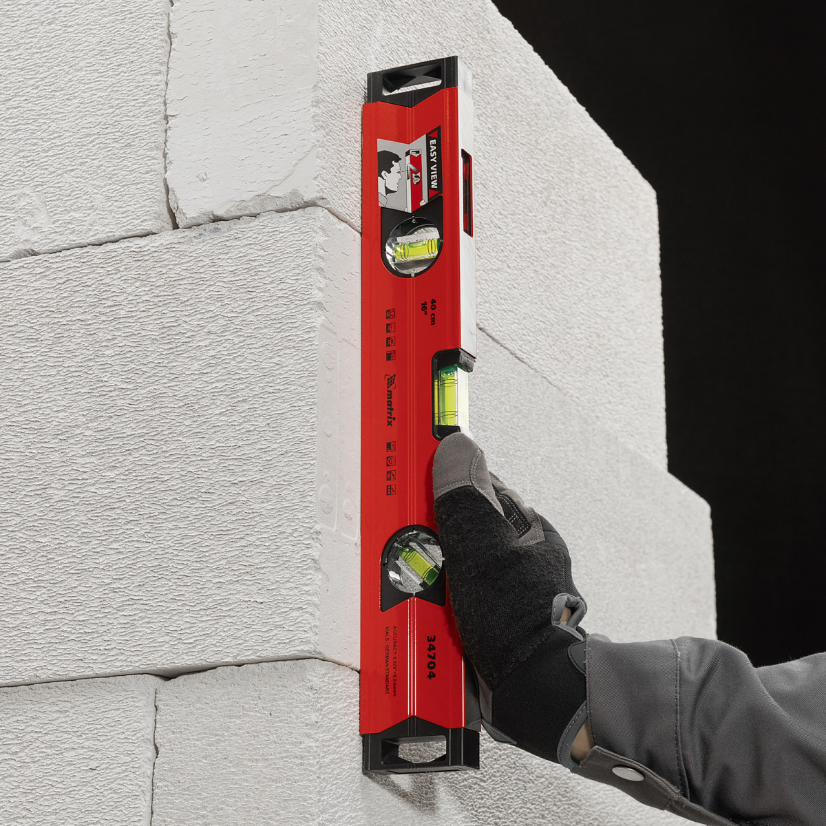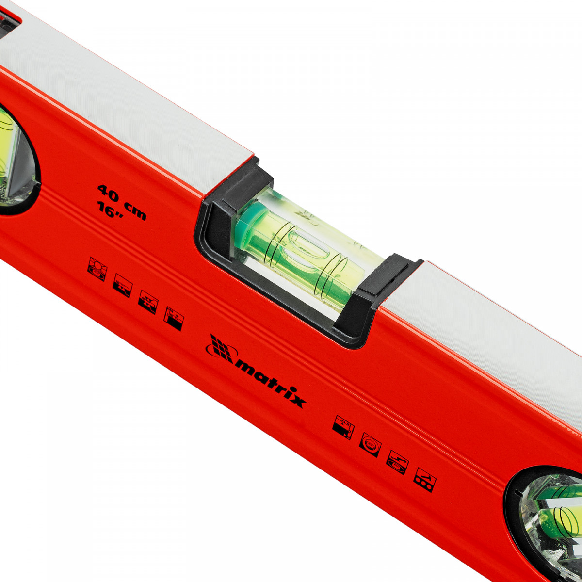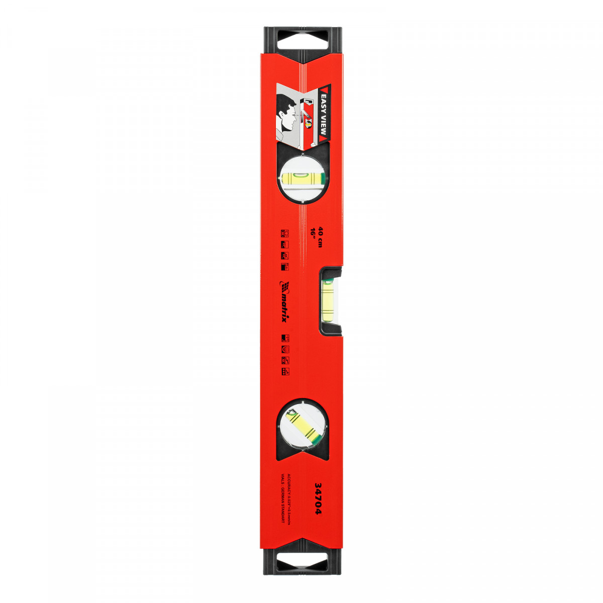 Алюминиевый магнитный уровень Matrix 34704 длиной 400 мм, усиленный, оснащен 3 глазками и одним зеркальным отражателем. С его помощью можно выявить отклонения от вертикали, горизонтали и угла 45 градусов. Встроенный зеркальный глазок повышает удобство работы, позволяя легко считывать показания.,Для определения отклонения вертикали 90 градусов необходимо использовать пузырьковую ампулу только в верхнем положении уровня. Только базовая поверхность является рабочей (противоположная ампуле 180 градусов).