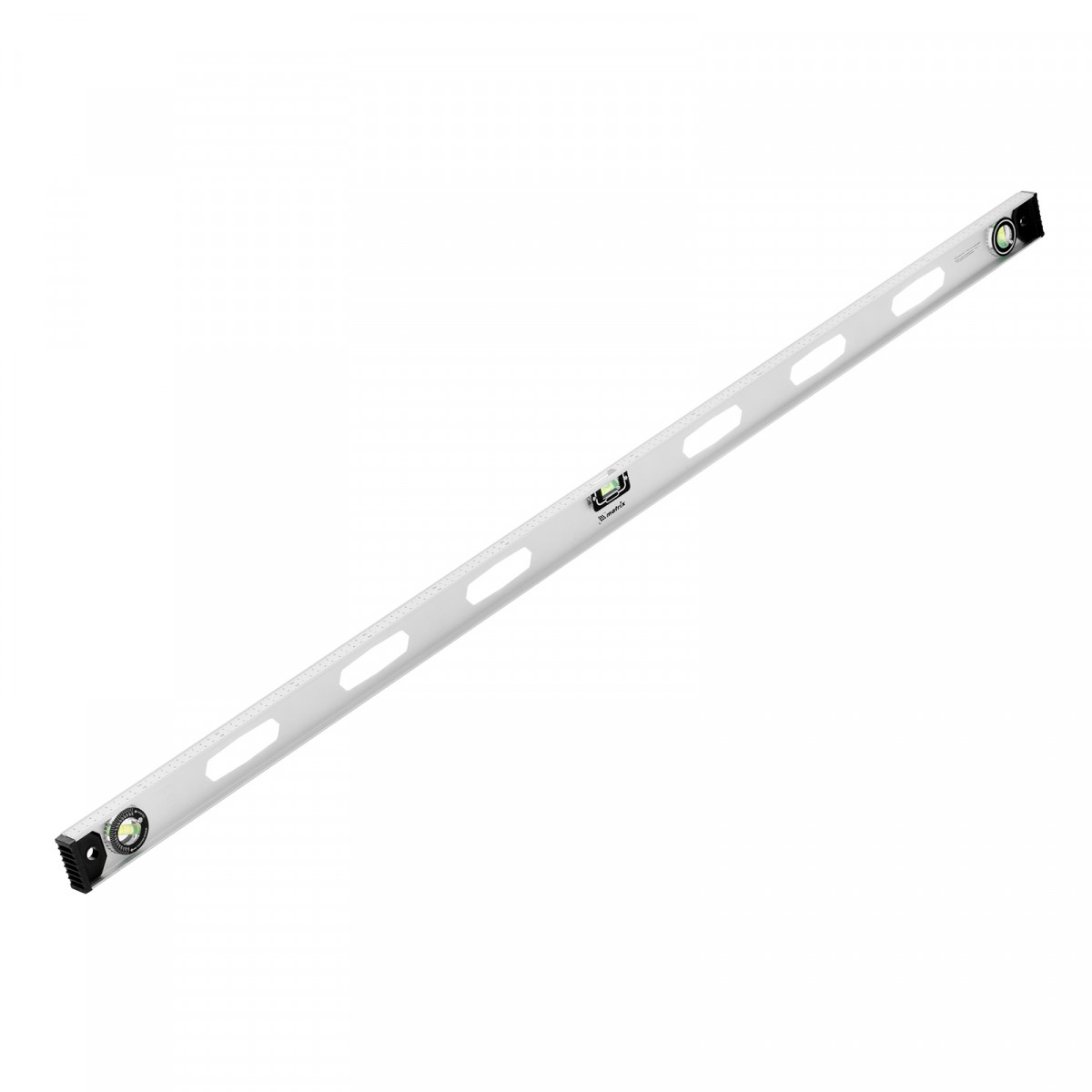 Алюминиевый уровень Matrix «Рельс» 34035 длиной 1500 мм имеет 3 глазка: 2 для проверки отклонений от заданной вертикали и горизонтали и 1 поворотный для проверки наклонных поверхностей.