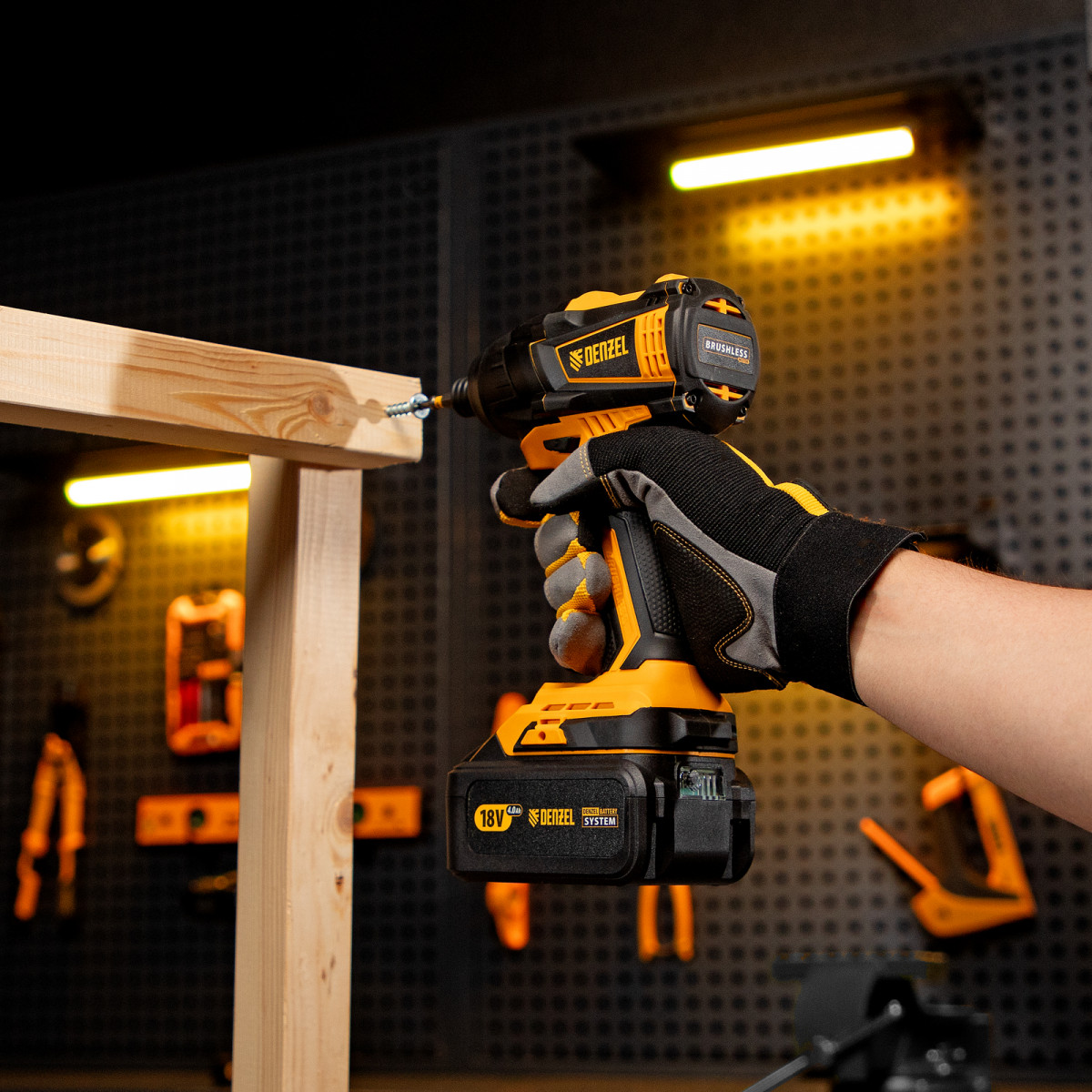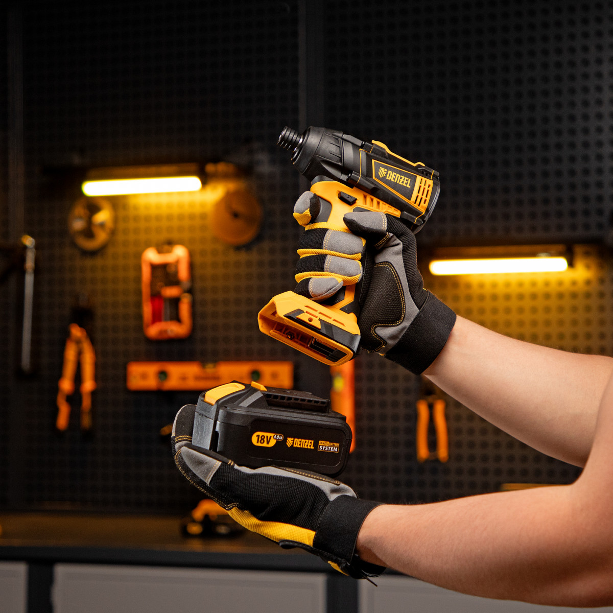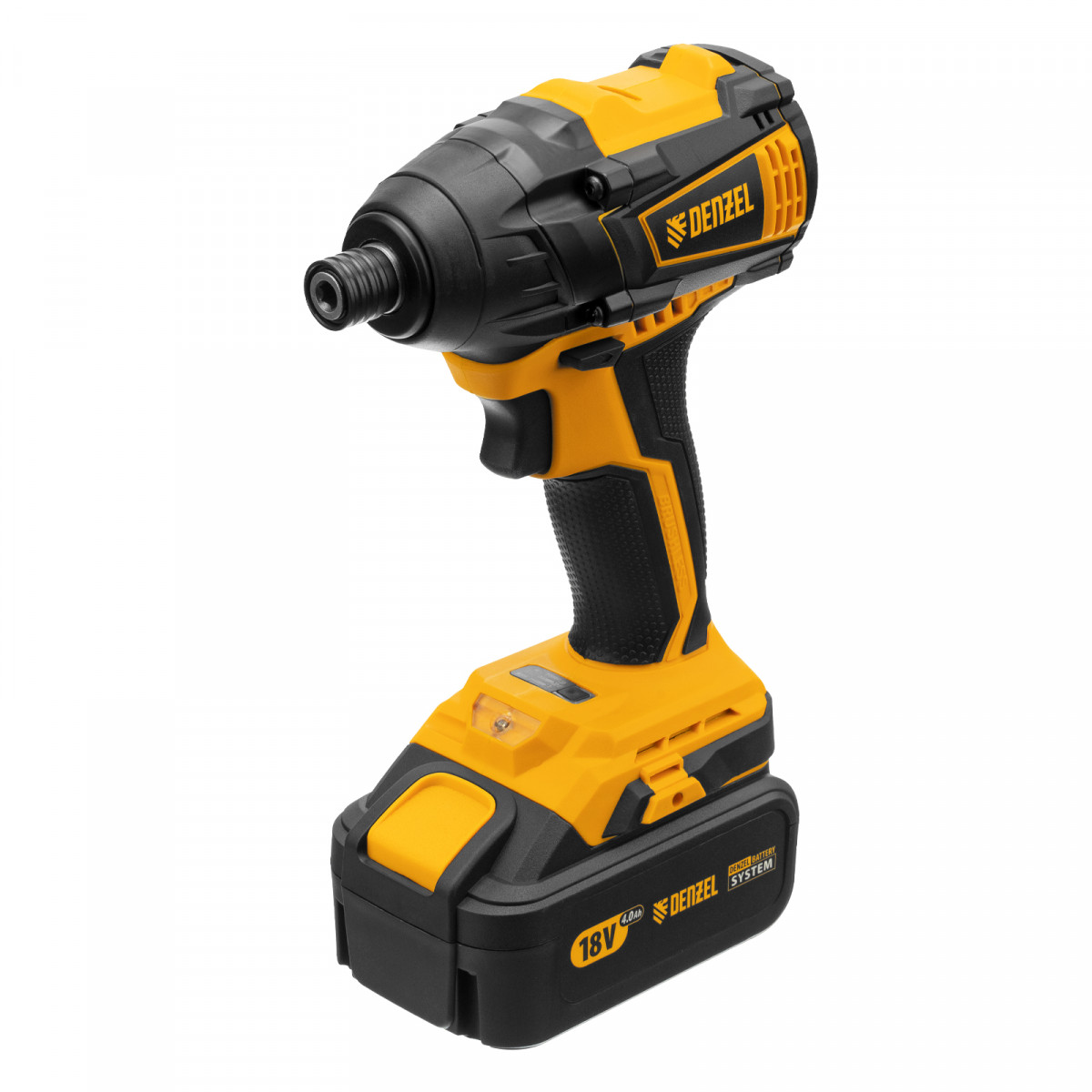 - Универсальность — к инструменту подойдут любые 18 В аккумуляторы Denzel battery system