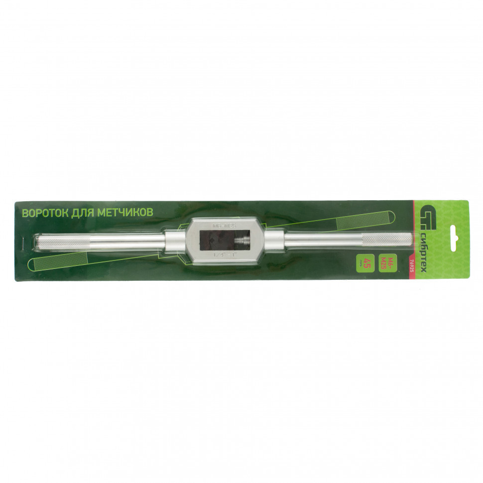 Вороток Сибртех 76925 подходит для зажима метчиков, используемых для ручного нарезания внутренней резьбы М6-М25 в отверстиях и цилиндрических деталях. Применяется во время ремонта резьбовых соединений, пригодится в мастерской или гараже.