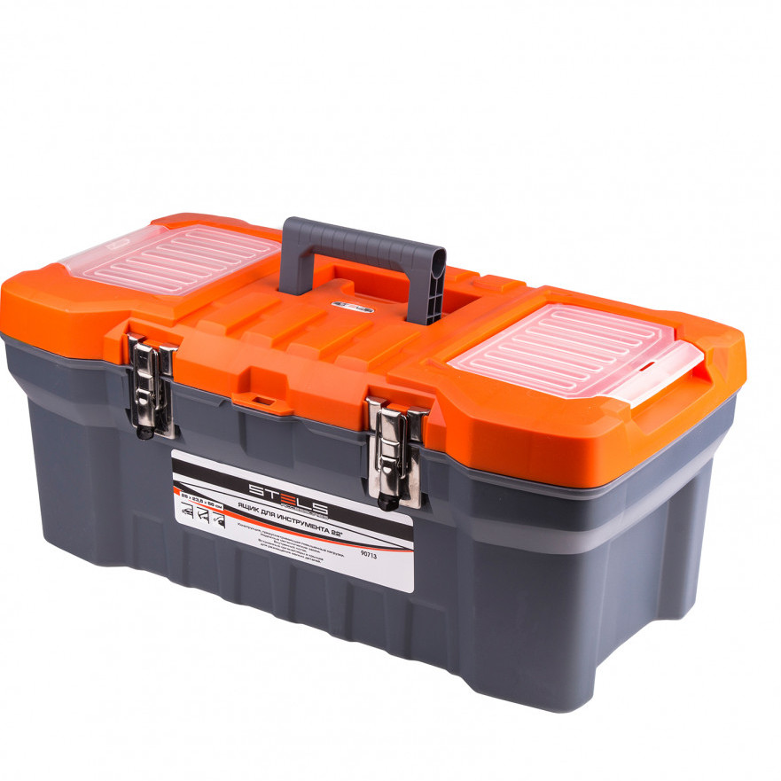 Ящик для инструмента с металлическими замками 22", 280х235х560мм STELS Россия 90713 - прочный и удобный переносной кейс для хранения ручных инструментов, бытовых мелочей, рыболовных снастей и пр. Изделие изготовлено из качественного пластика и усилено металлическими замками.