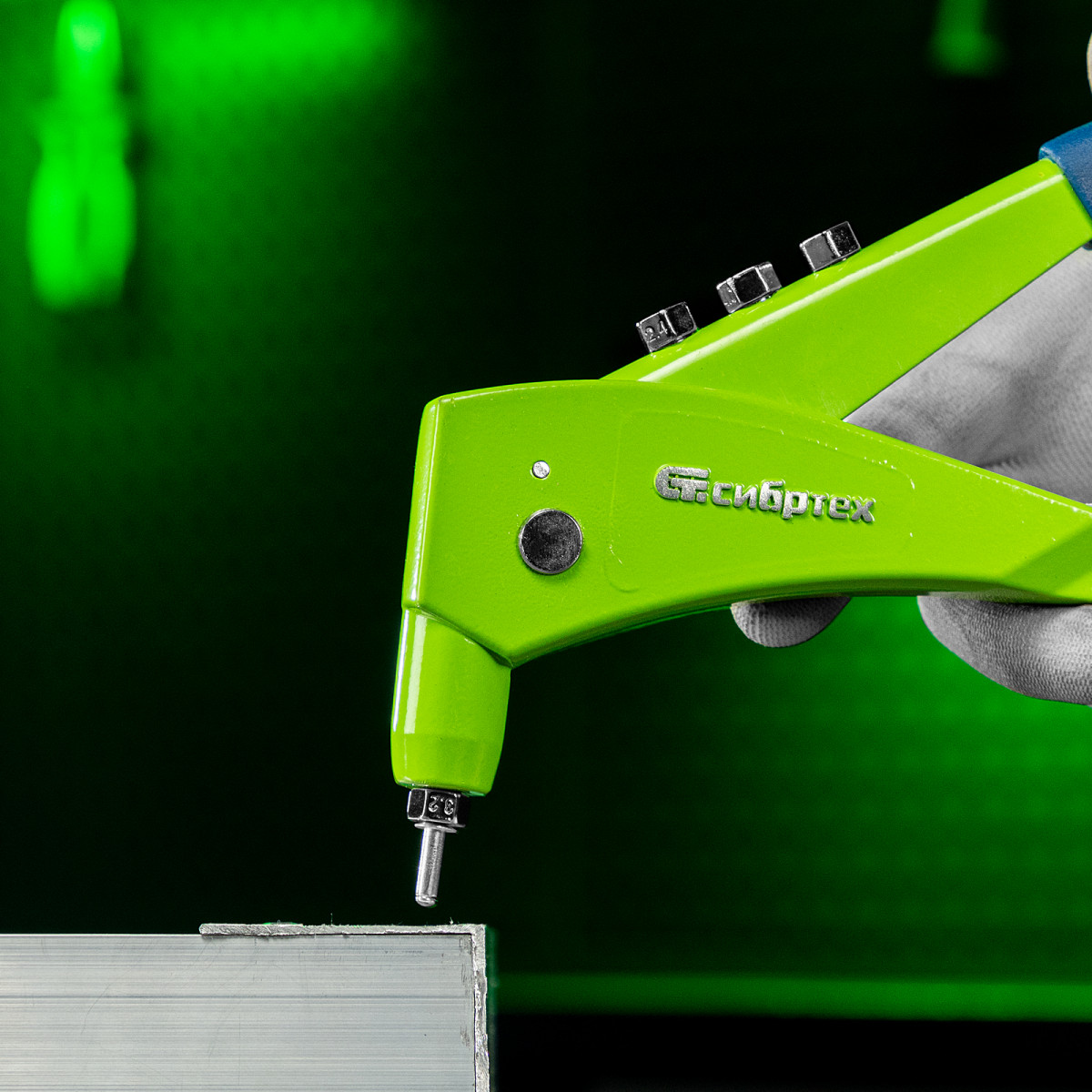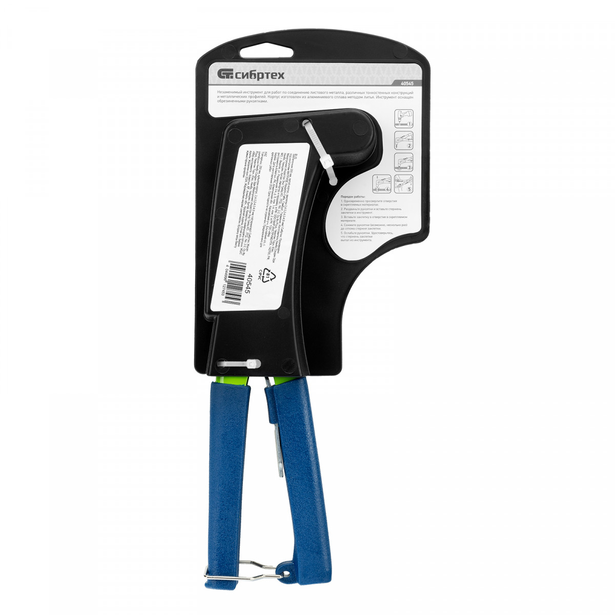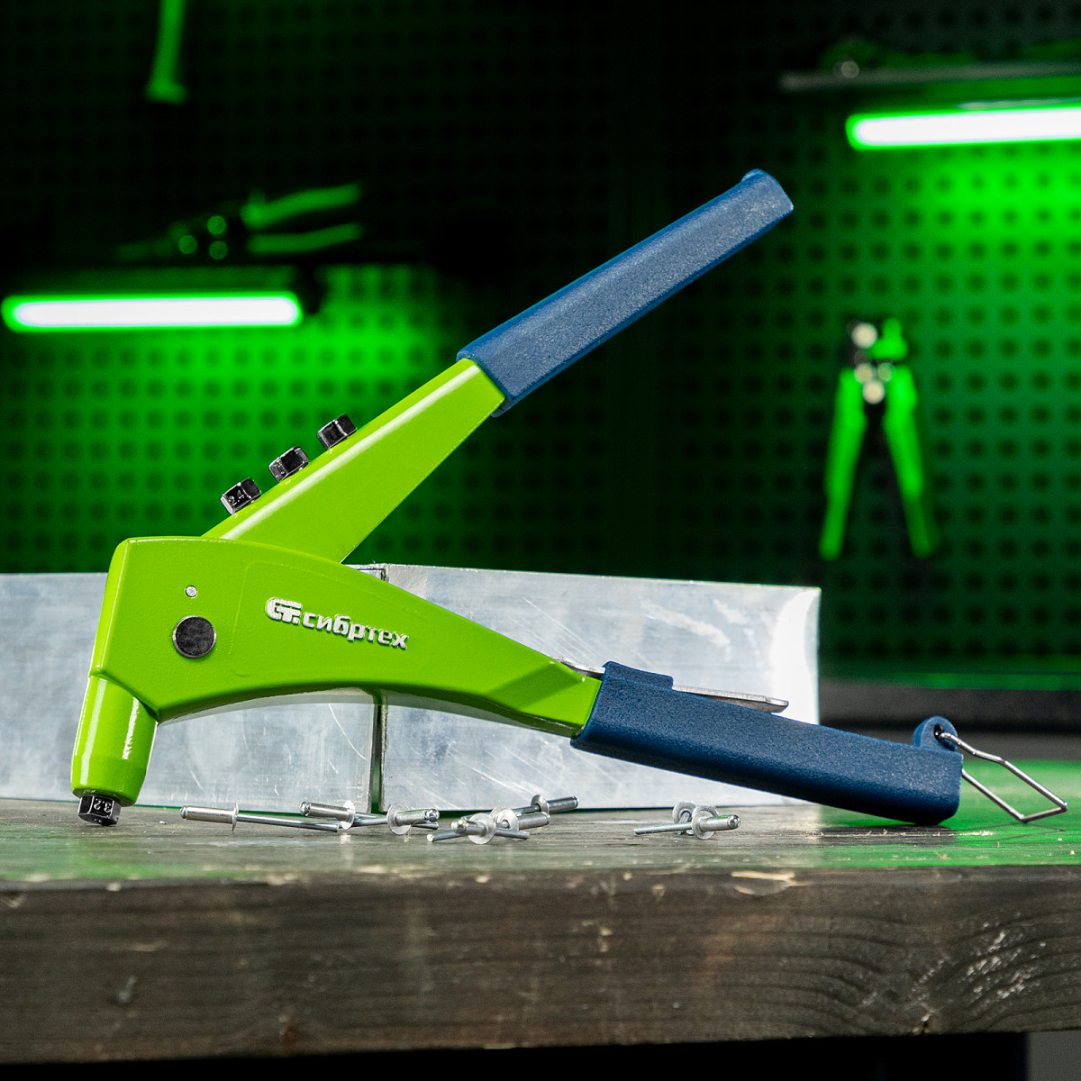 Заклепочник Сибртех 40545 длиной 250 мм с литым корпусом, пригодится для крепления листового металла вытяжными заклепками диаметром 2,4-3,2-4,0-4,8 мм. Он гарантирует долговечное и неразъемное соединение материалов. Заклепочник будет полезен профессиональным строителям и частным мастерам при возведении забора из профнастила, сборке металлоконструкций и других работах.