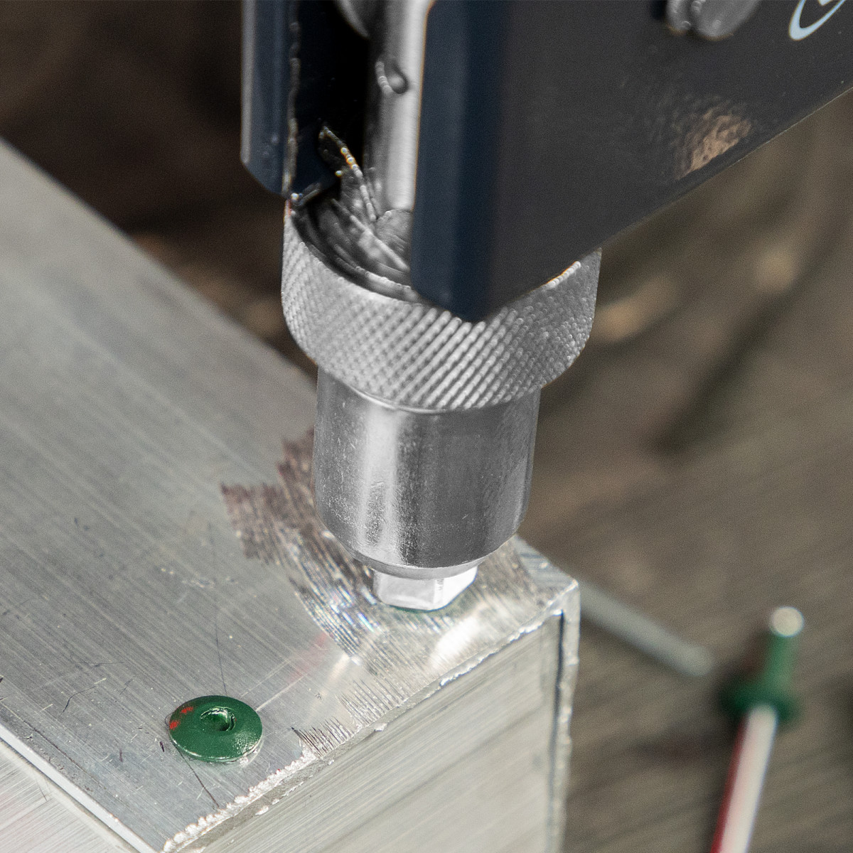 - Быстрая установка насадок — сменные головки для заклепок разных диаметров размещены на корпусе, монтажный ключ для их замены входит в комплект поставки.
