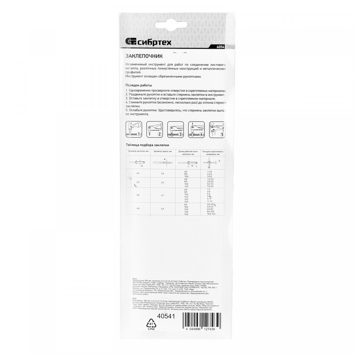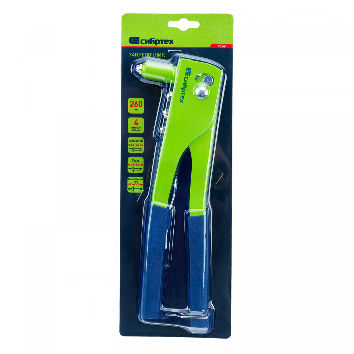 Заклепочник 260 мм, заклепки 2.4-3.2-4.0-4.8 мм Сибртех