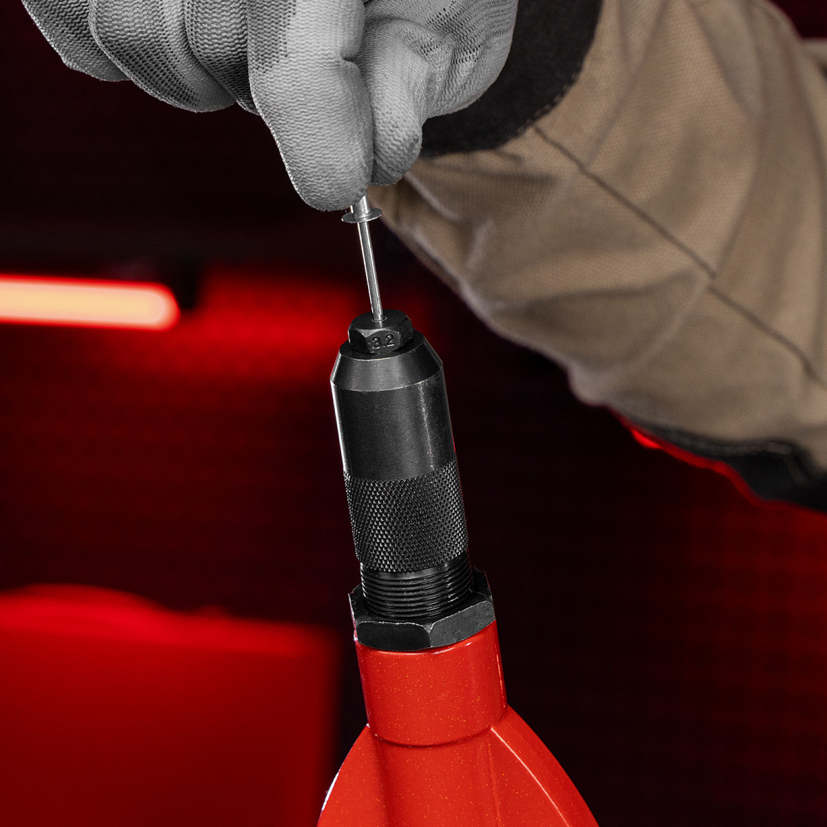 - Надежная фиксация крепежа — трехлепестковый зажимной механизм крепко удерживает вытяжной стержень заклепки