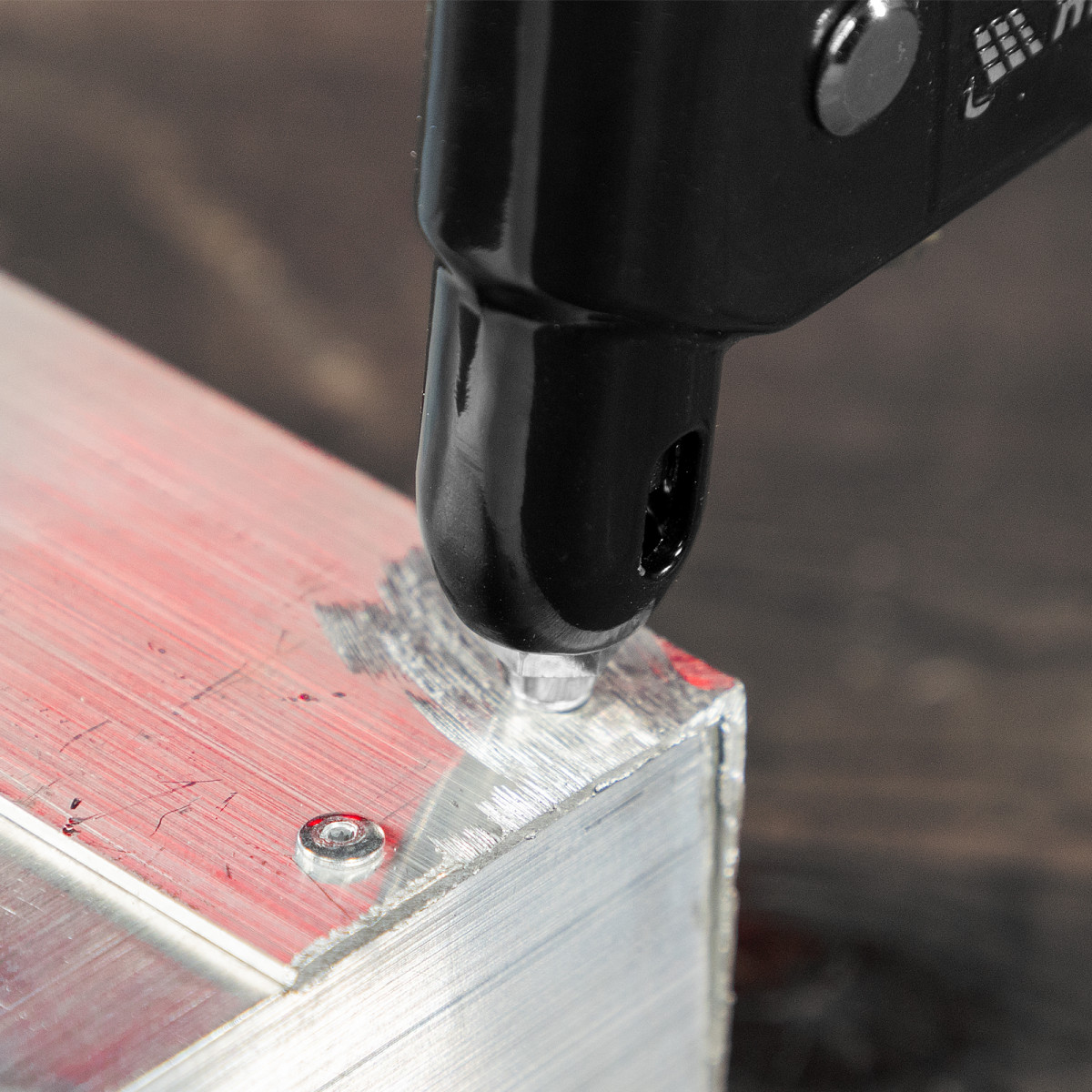 - Эффективная работа — двухсегментный цанговый механизм из хромомолибденовой стали крепко захватывает вытяжную шпильку заклепки.