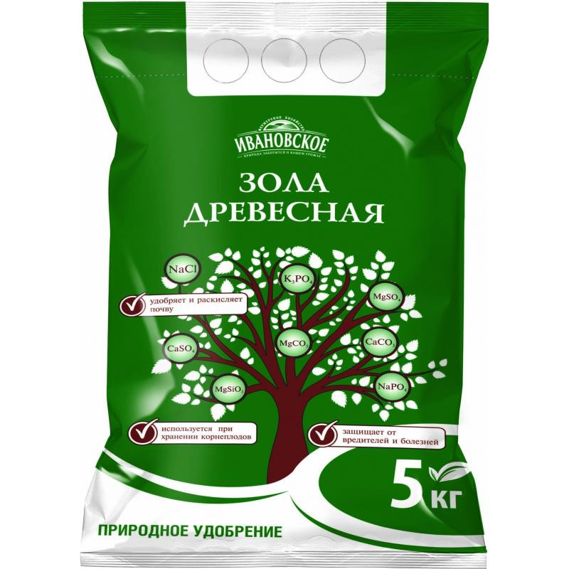 Зола древесная в удобной упаковке весом 5 кг.